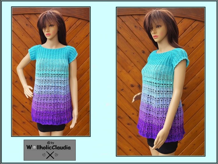 Die Tunika/ das Kleid "Liliana" wird als Rvo ( Raglan von oben) in einem Stück gearbeitet und kann individuell an jede Größe und Länge angepasst werden. Ob lang als Kleid- oder etwas kürzer als Tunika, du häkelst es genau auf deine Wünsche abgestimmt, die Vorgehensweise ist ganz genau erklärt. Ideal für alle Farbverlaufsgarne.