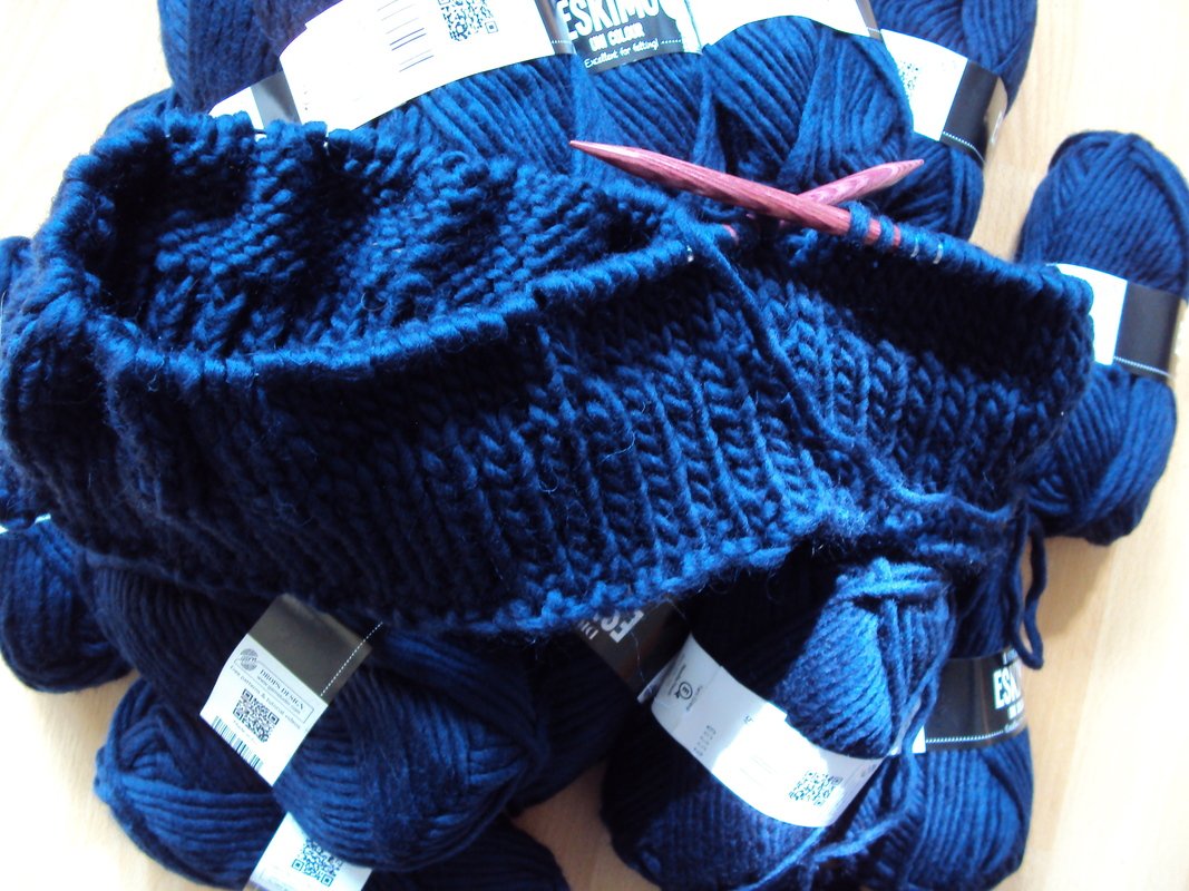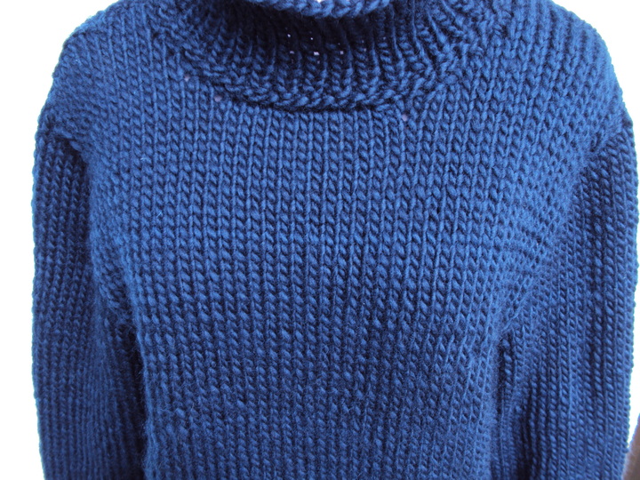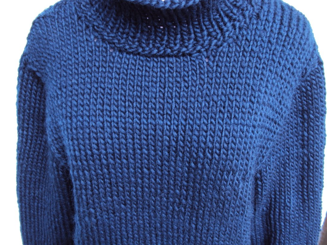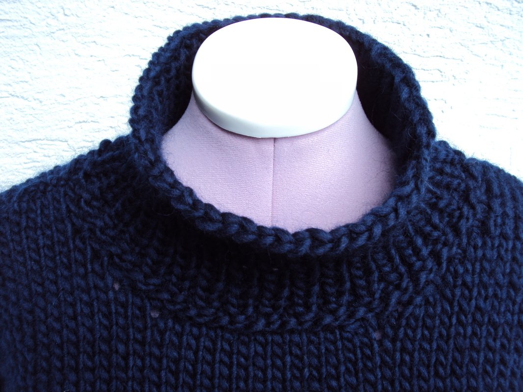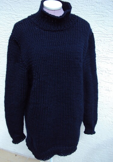 Dieser Pullover passt durch die legere Machart für Größe S/M/L. Er ist auch für Herren geeignet. Er wird mit dickem Garn und Nadeln Nr. 7 und 8 gestrickt. Das Dochtgarn aus reiner Schurwolle ist sehr weich und lässt sich sehr gut und schnell verstricken. Der Kragen ist ein Turtleneck - Kragen, er kann aber auch zum Rollkragen weiter gestrickt werden.