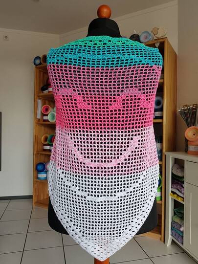 Das Tuch wurde mit ca. 750 Metern LL sowie 4 fädigem Farbverlaufsgarn und einer 4er Nadel locker gehäkelt. Es hat die Maße: ca. 180 cm x 95 cm
