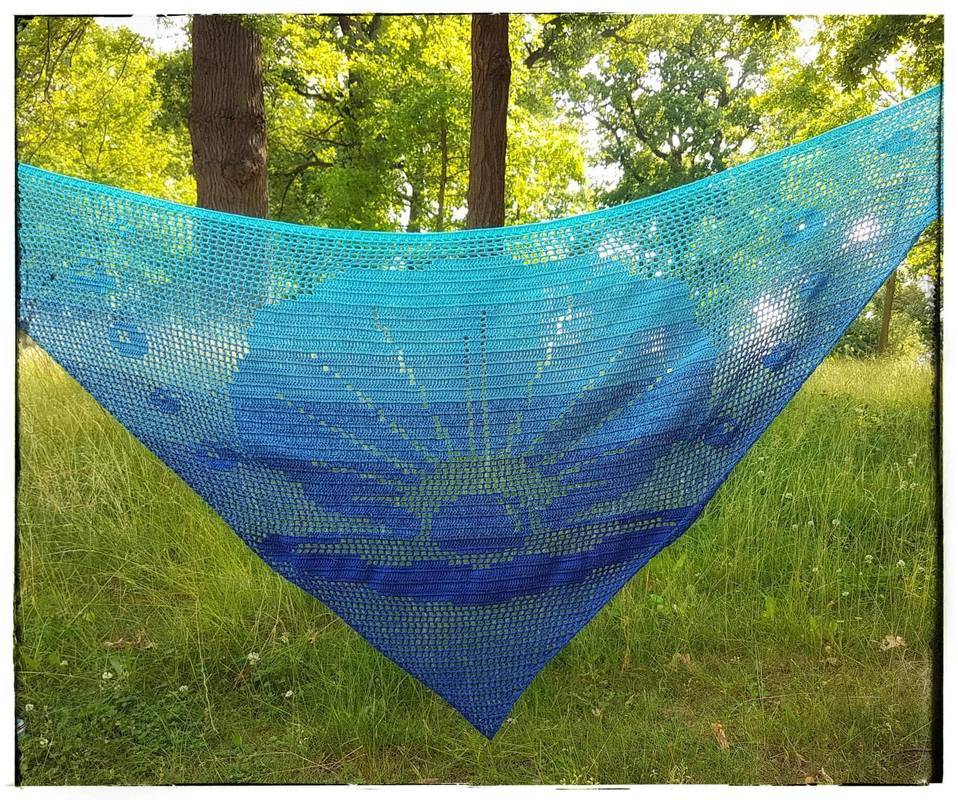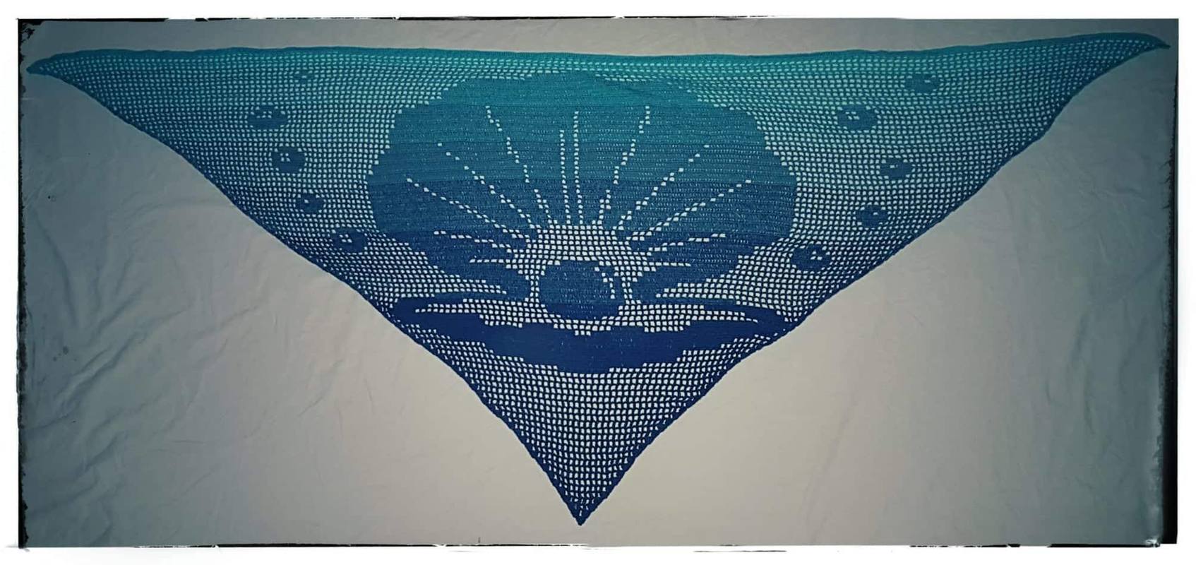 Das Tuch wurde mit ca. 1250 Metern LL sowie 3 fädigem Farbverlaufsgarn und einer 3er Nadel locker gehäkelt. Es hat die Maße: ca. 200 cm x 95 cm