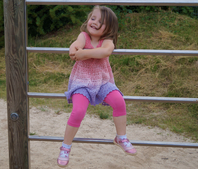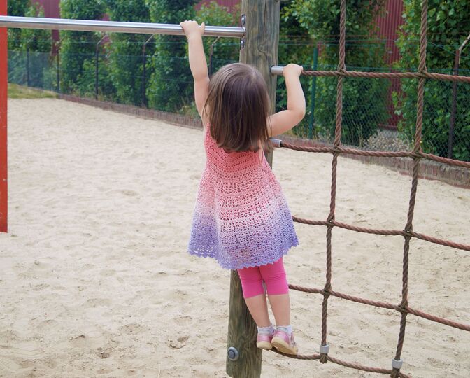 Kleid wird von oben nach unten gehäkelt so, dass die jeder Größe individuell angepasst werden kann.