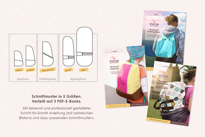 Wähle deine Wunschgröße! Den Rucksack "KlapPack" gibt es in 5 Größen, verteilt auf 3 E-Books (oder auch im Spar-Set mit allen Größen). Hier bekommst du das Herzstück der KlapPack-Serie in der Größe "Midi".