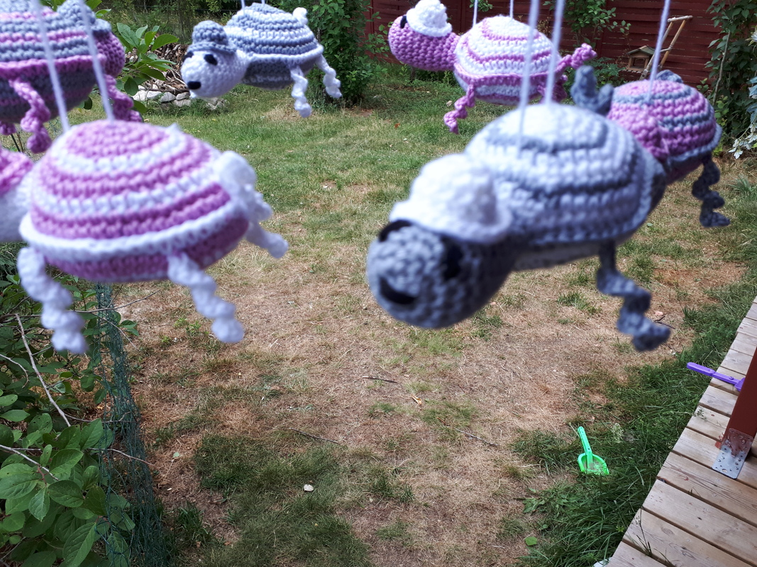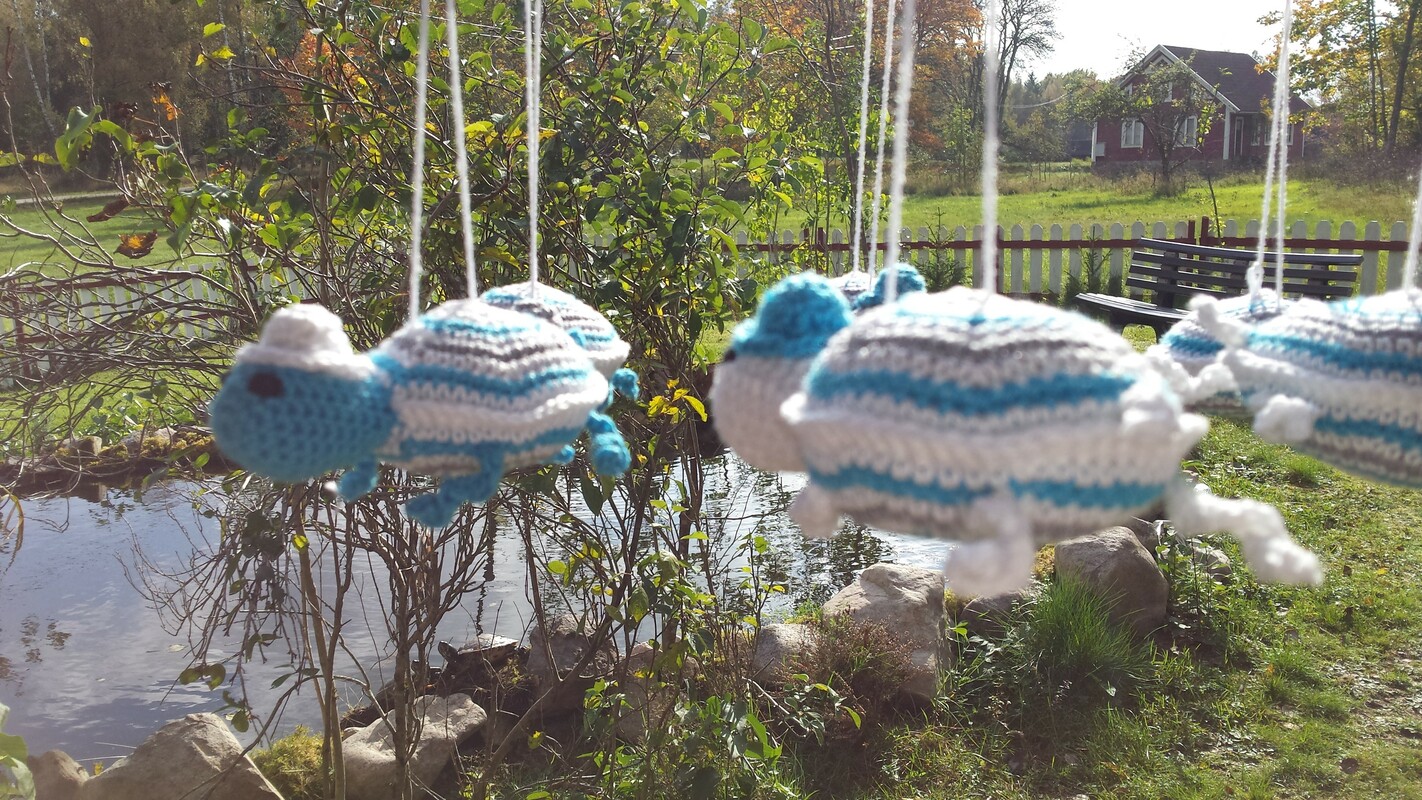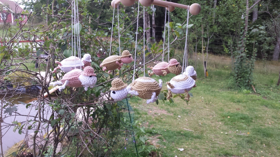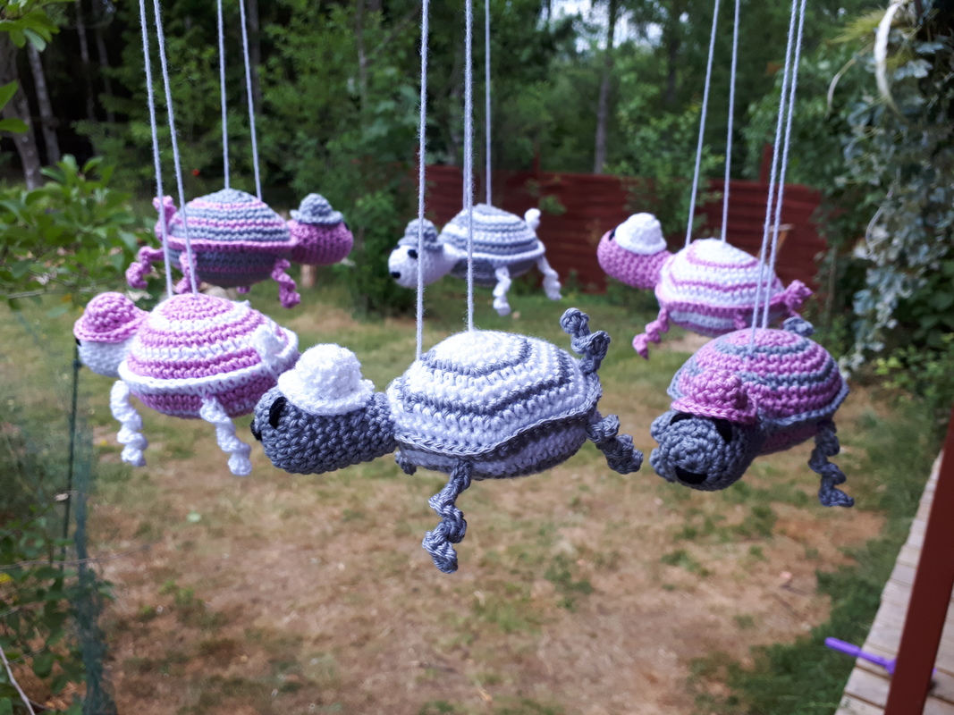 Fröhlich und mit Hut ausgerüstet schaukeln die Schildkröten am Mobile.