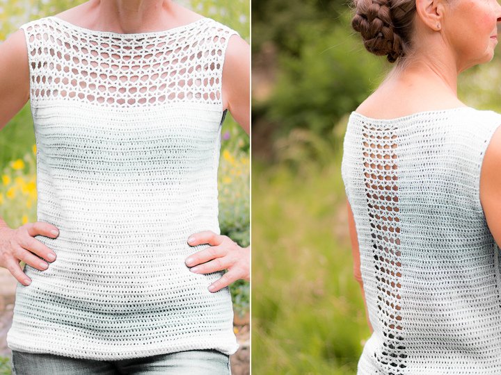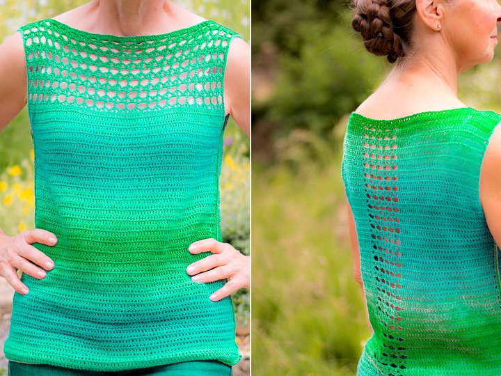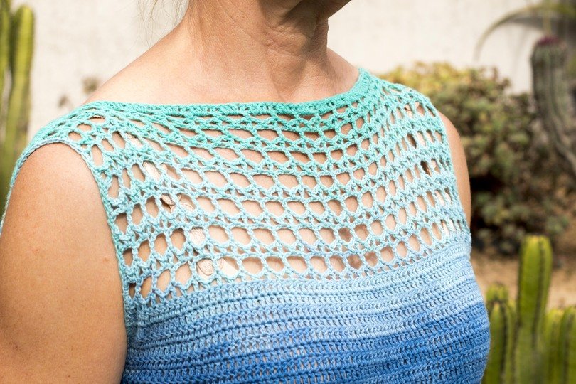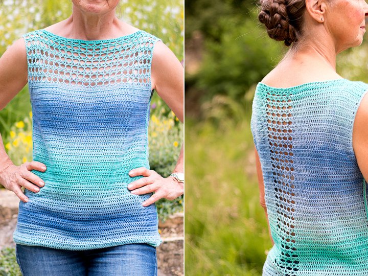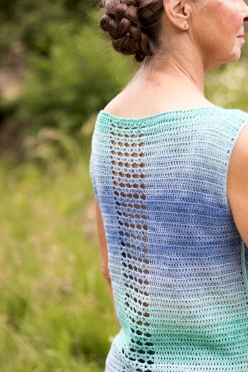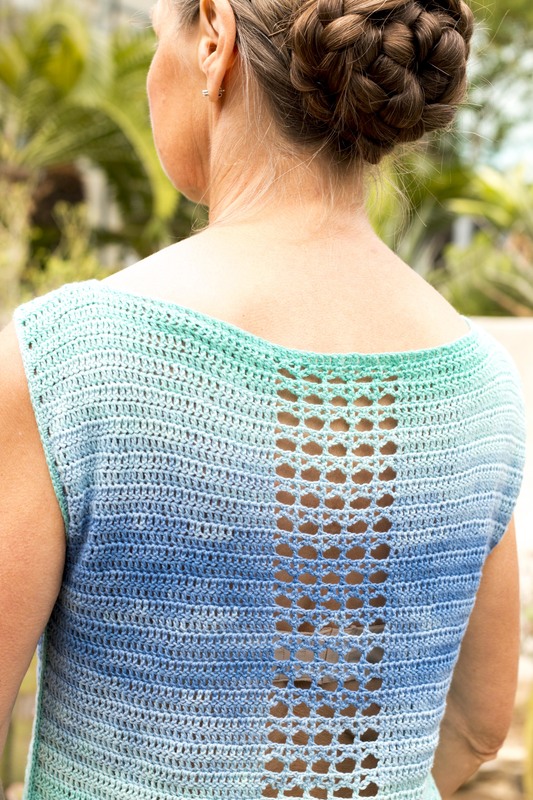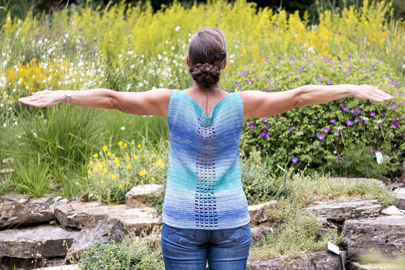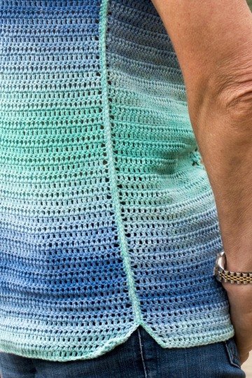 Bei diesem Top wird zunächst das Vorderteil von unten nach oben in Reihen hoch gehäkelt, dann folgt der Halsausschnitt und dann wird direkt das Rückenteil von oben nach unten gehäkelt. An den Schultern gibt es keine Nähte, Vorder- und Rückenteil werden jeweils an den Seiten unter den Armen zusammengehäkelt. Du häkelst hier also nicht 2 Teile, sondern Vorder- und Rückenteil gleich in einem Rutsch! :-)