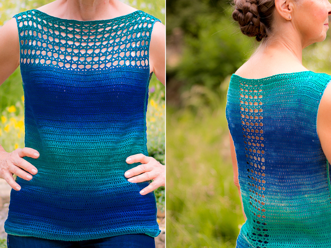 Wie immer ändert sich der Look total, je nachdem welches Garn in welcher Farbe du nimmst. Mit einem tollen Farbverlauf zauberst du ein fröhlich-buntes Everyday-Shirt und in einem edlen dunkelblau mit einem Satin Top darunter bist du damit der Hingucker auf festlichen Anlässen.