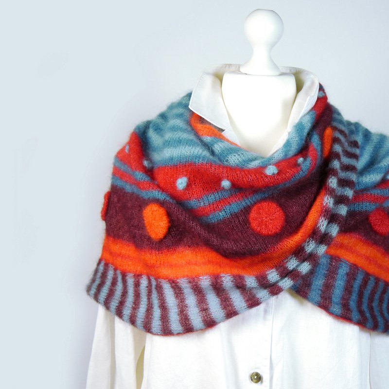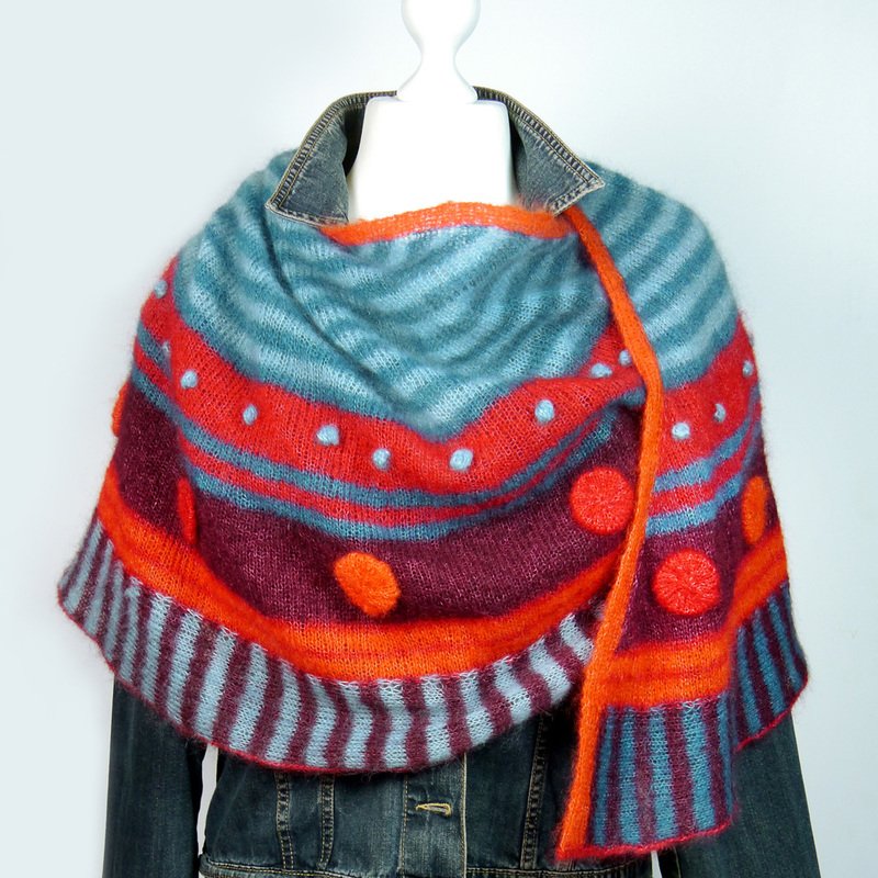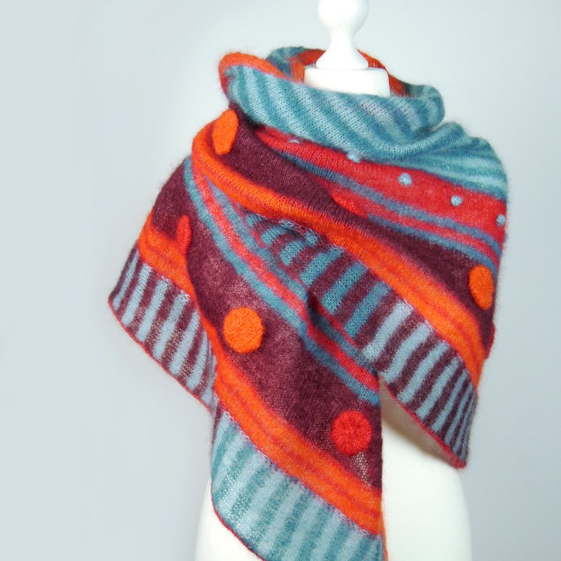 Von der ersten Idee bis zum fertigen Tuch hat es übrigens ein ganzes Jahr gedauert. Ich wollte unbedingt große, dicke, runde Punkte für dieses Tuch – aber das war gar nicht so einfach. Bis ich endlich die zündende Idee hatte, und die war eine echte Punktlandung!