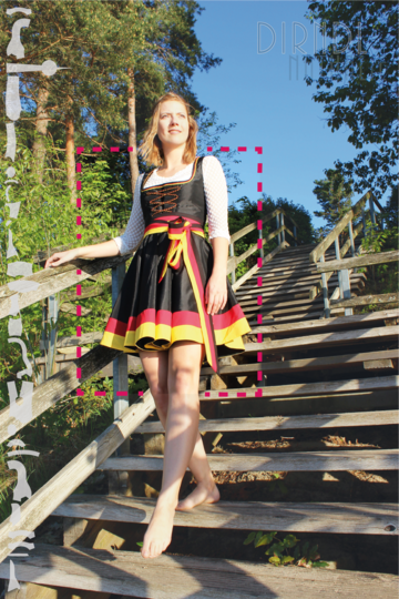 Dirndl Nathalie gibt es mit 2 Rocklängen - 50cm und 70cm, die beide im Schnittmuster enthalten sind. Unser Fandirndl auf den Fotos hat die Rocklänge 50cm. Wir haben das Dirndl aus schwarzem Taft genäht und dazu roten und gelben Baumwollstoff kombiniert. Seitlich gibt es einen Reißverschluss. Das Mieder des Dirndls ist innen gefüttert.