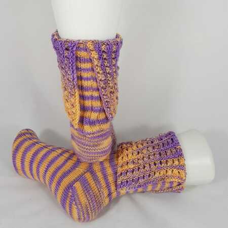 Die Socken sind in Grösse 40/41 gestrickt, können aber, wenn der Fussbereich ein paar Runden mehr oder weniger lang gestrickt wird durchaus auch für Grösse 38/39, bzw. 42/43 passend gearbeitet werden. Ich habe mit 4-fach Sockenwolle gestrickt. (Wolle sollte ca. 420m/100g haben, um die gleichen Grössen zu erreichen)