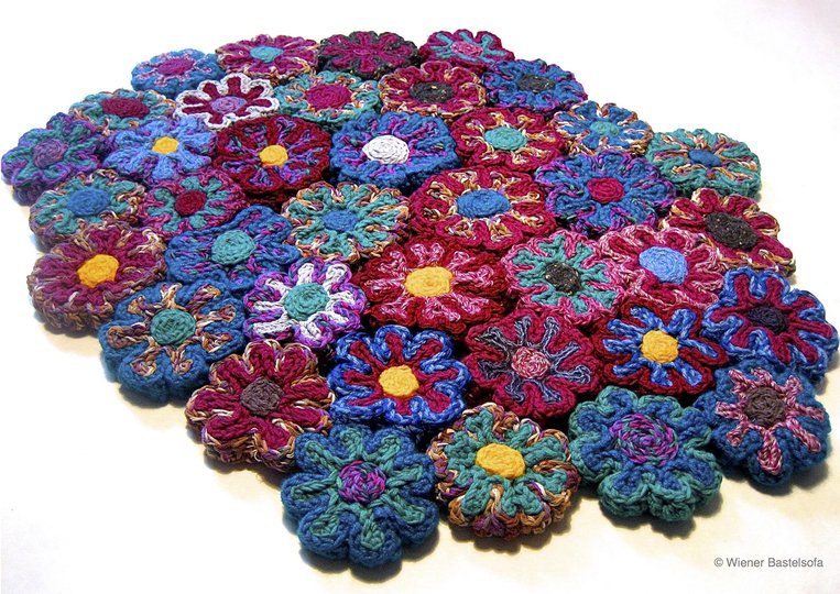 Orientierungshilfe für die Berechnung der Wollmenge: Die einzelnen Blüten wiegen je nach Größe und Wollqualität 30-50 g. Der hier abgebildete Teppich hat ein Gesamtgewicht von 1380 g, ist ca. 55 x 75 cm groß und ca. 1,5 cm hoch.
