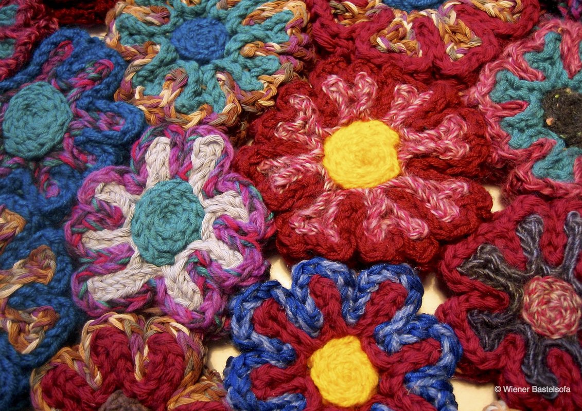 In der Anleitung werden die einzelnen Arbeitsschritte für das Zusammennähen der Blüten und das Zusammenfügen der Blüten erklärt. Wie viele Blüten du häkelst und wie du sie anordnest, kannst du nach deiner eigenen Vorstellung, sowie deinen Wollfarben und Wollresten entscheiden.