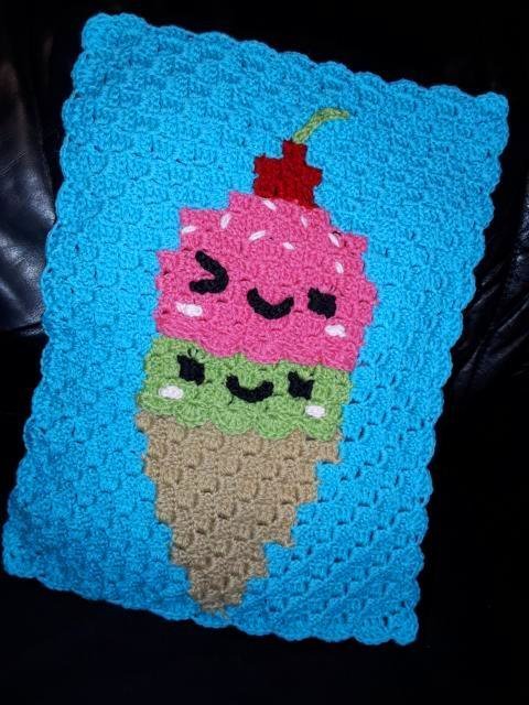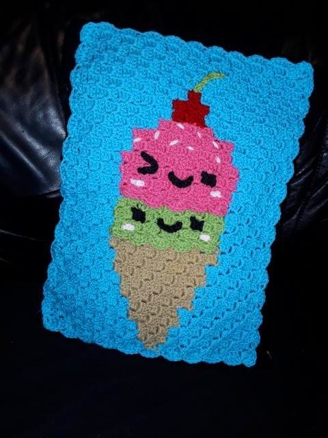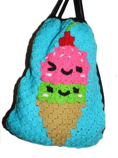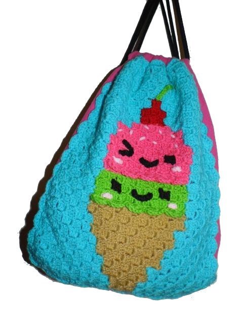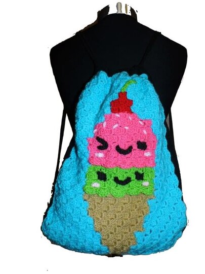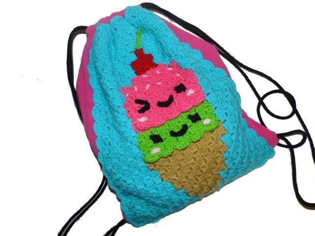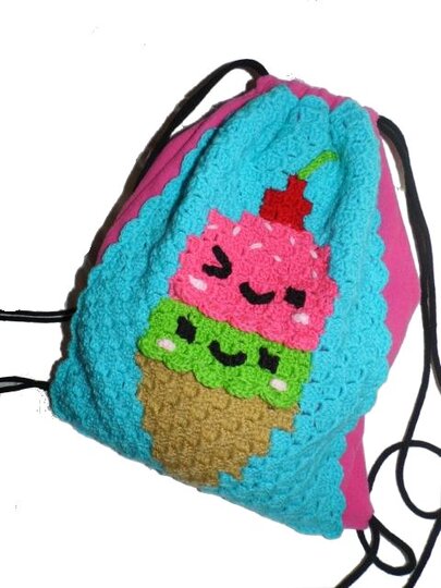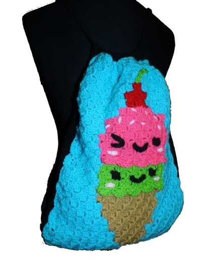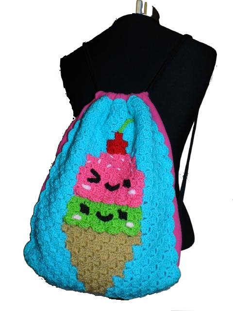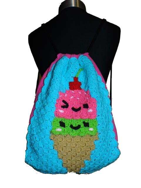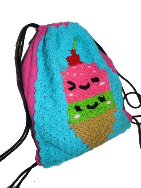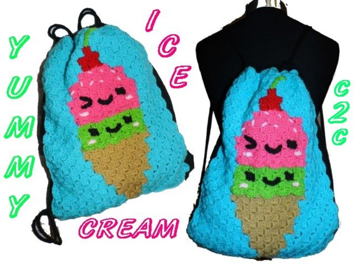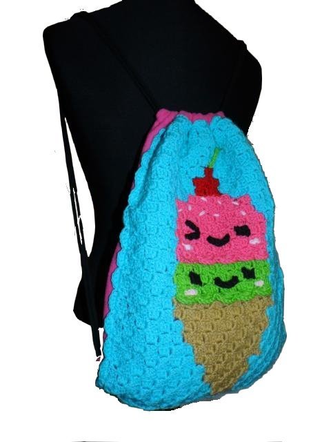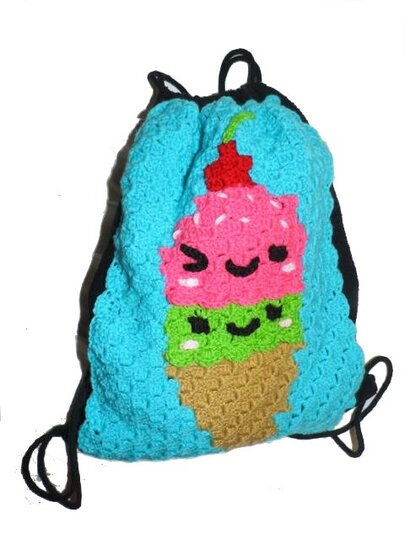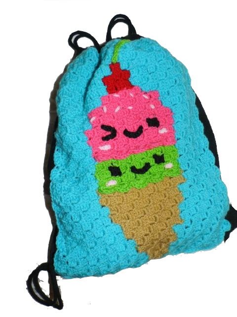 Dieser Rucksack bzw. das Frontbild ist mit der "Ecke zu Ecke" oder c2c Technik gehäkelt.