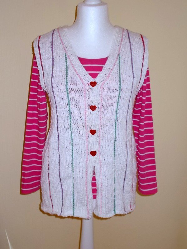Hier bekommst du eine Strickanleitung für eine weiße (unifarbene) Weste mit eingestrickten und farbigen vertikalen Streifen, die aus weißer Bouclé-Baumwolle gestrickt ist. Die hier angegebenen Maße beziehen sich auf die Größe 40/42, können aber von erfahrenen Strickerinnen leicht abgewandelt werden.