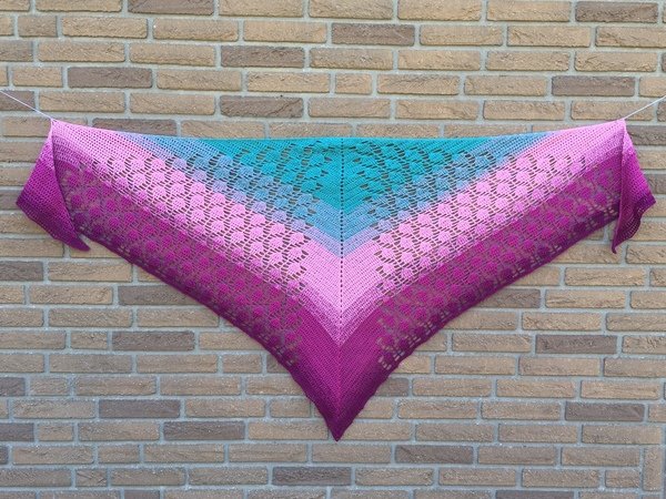 Wenn Sie mit dem angegebenen Garn und der genannten Nadelstärke arbeiten und die Maschenprobe gemacht haben, wird das fertige Tuch ca. 215 x 95 cm.