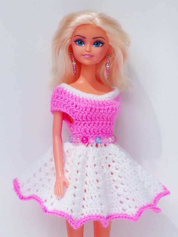 So ein kleines, feines Puppenkleidchen ist auch von Häkelanfängern schnell und einfach aus ein paar Gramm Wolle zu häkeln. Das Kleid wird in einem Stück von oben nach unten gehäkelt. Für den Rock ist eine Häkelgrafik beigefügt. Die Kleidchen werden im Rücken mit 3 Druckknöpfen geschlossen und sitzen perfekt. Wer möchte, könnte noch ein Blümchen häkeln und damit das Kleid dekorieren.