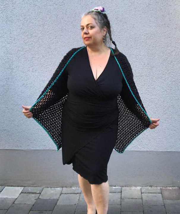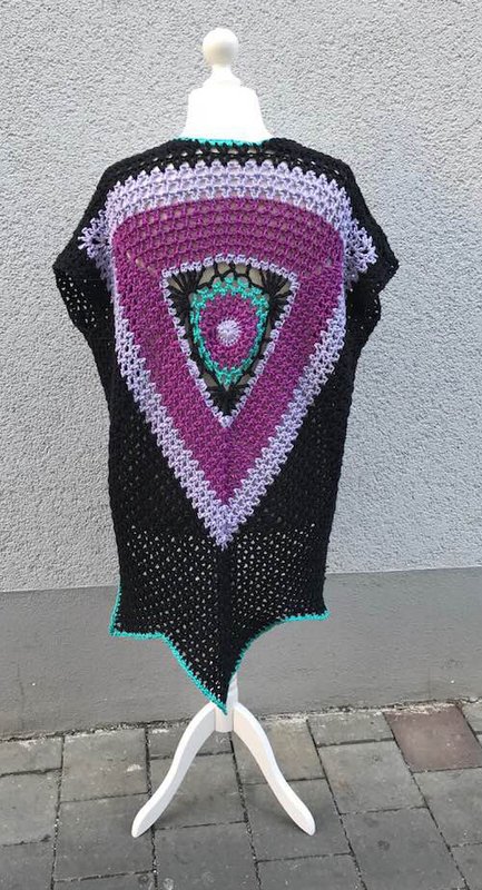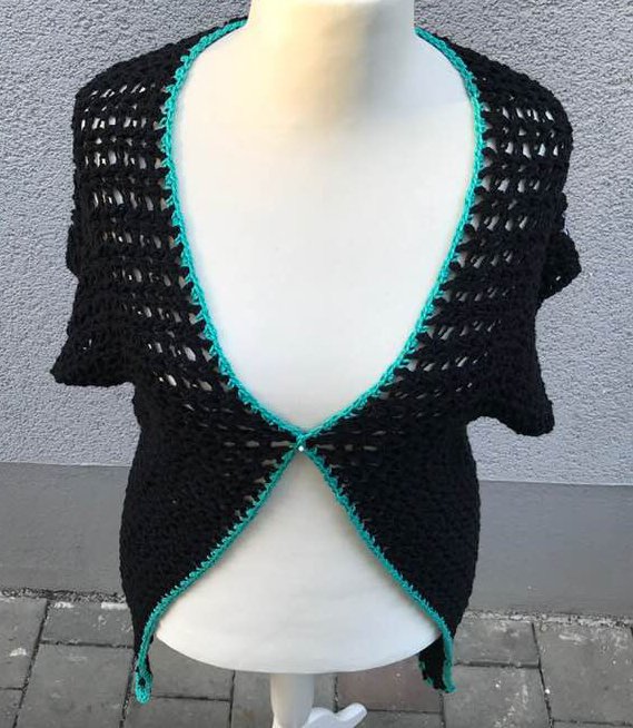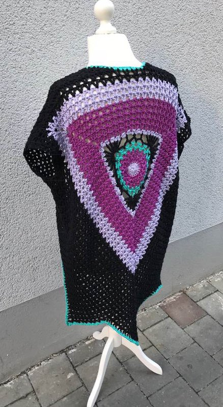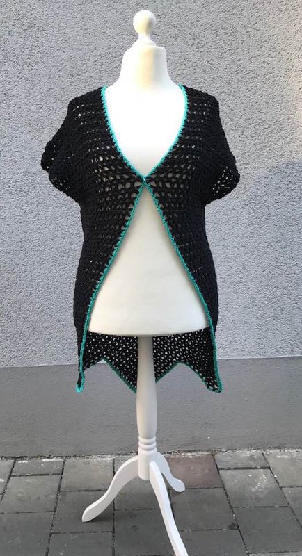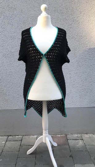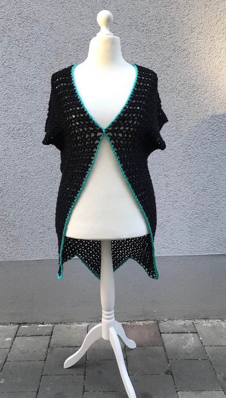 Sie hat ein recht lockeres Muster ....man kann sie im Winter wie im Sommer tragen. Besonders raffiniert ist hier der Schnitt und die 3 Spitzen am unteren Rand