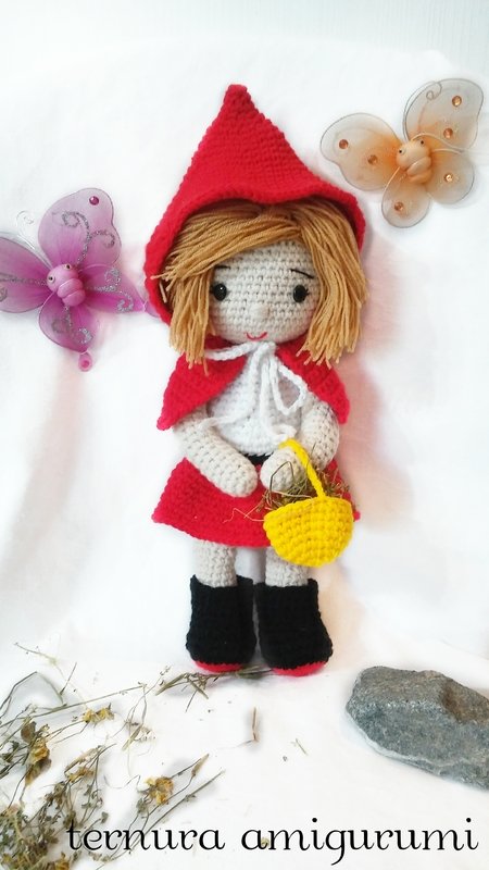 Sarah ist eine sehr hübsche Puppe mit viel Stil und süßen Looks. Er ist getarnt wie ein Rotkäppchen und hat einen schönen Korb zum Abholen! Die endgültige Höhe beträgt 30 cm (ohne Hut). Sie können diese Größe variieren, mit der Dicke der Wolle und Nadel