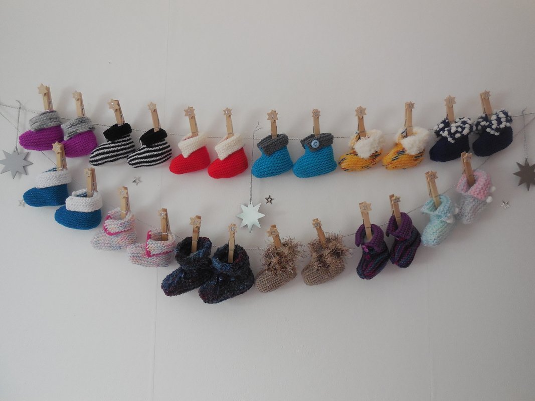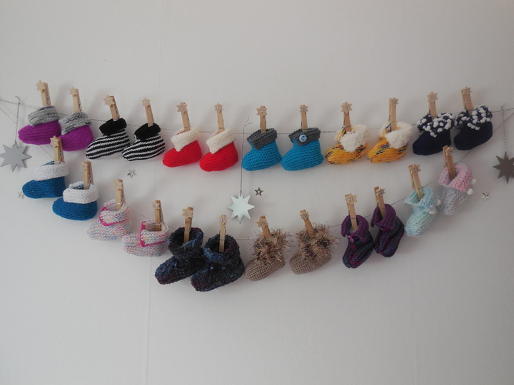 Auch als Adventskalender sehr gefragt, da man die Söckchen mit allerlei Sachen fürs Baby und die werdende Mama befüllen kann und die Söckchen danach auch getragen werden können.