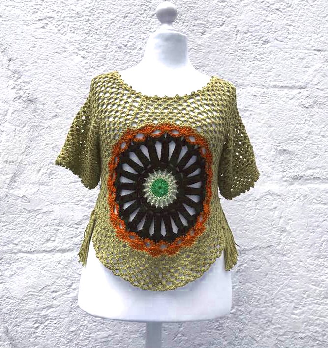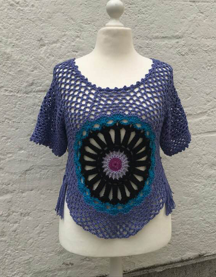 Das schöne Sommershirt SONNENGEFLECHT hat vorne und hinten einen schönen Häkel-Kreis mit Strahlen...und ist einfach nach zu machen.