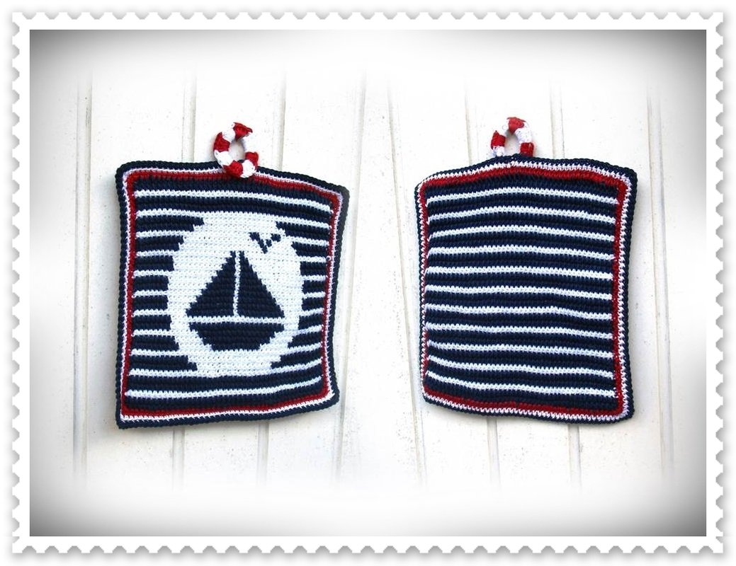 Mit Streifen und Segelbootmotiv besteht das Küchenhelferlein aus Zwei Hälften. Beide Seiten sind im tunesischen Grundstich gehäkelt. Die Vorderseite mit eingehäkelten Motiv und die Rückseite ist schlicht gestreift. Die Anleitung enthält einen Übungsteil für diese tolle Häkeltechnik.