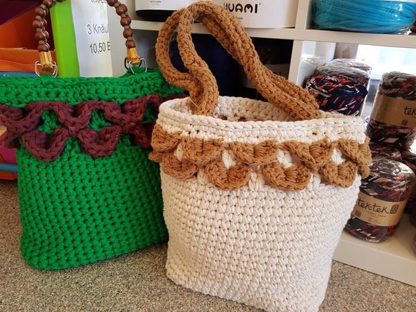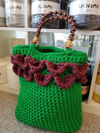 In dieser Anleitung zeigt Sabrina von Karlems Lädchen, wie eine Tasche aus Textilgarn mit Korb-Bogen gehäkelt wird. Dazu kommt ein schönes Blumenmuster im oberen Bereich der Tasche.