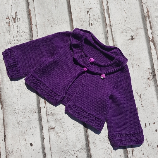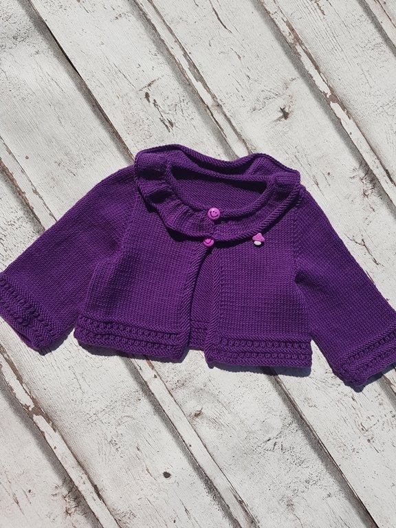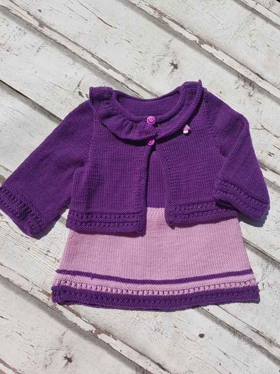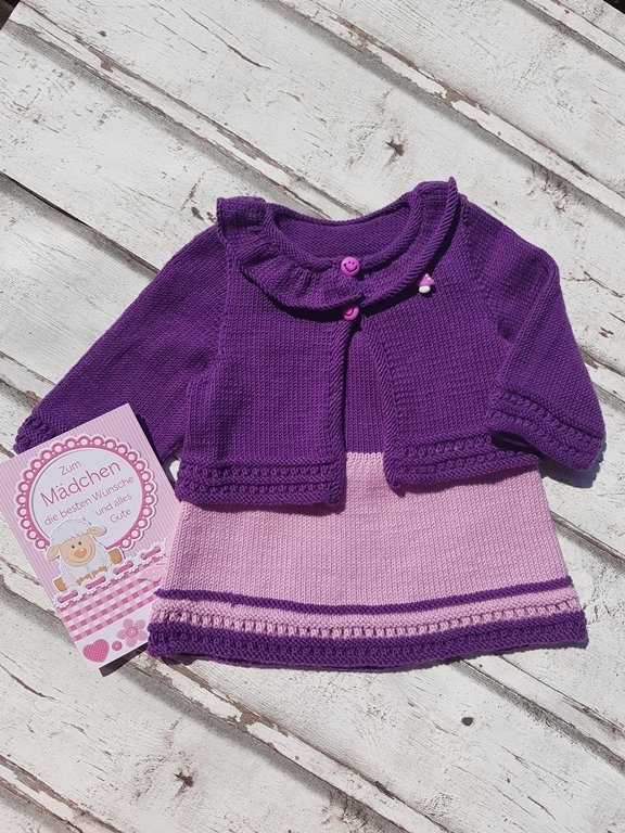 Ein Set für kleines Mädchen, welches mit dem Kind zusammen wachsen kann – einfach ein paar Reihen beim Kleid oder Ärmel länger stricken und schon passt es wieder. Beide Teile sind am Stück gestrickt, nur mit zwei Schulter Nähten. Das Kleid ist leicht tailliert, in Trendfarben und ein kleiner Knopf auf dem Rückenteil zum Reinschlüpfen. Der Bolero hat vorne zwei Knöpfe. Die Ärmel sind ebenfalls am Stück, von oben gestrickt. Für die Größen 62/68 (74/80, 86/92, 98/104)
