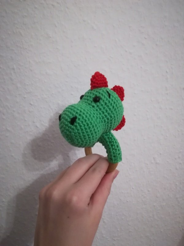 Mit Häkelnadel 3,0 mm und der Schachenmayr Catania Wolle wird die Dinorassel 12 cm groß.