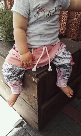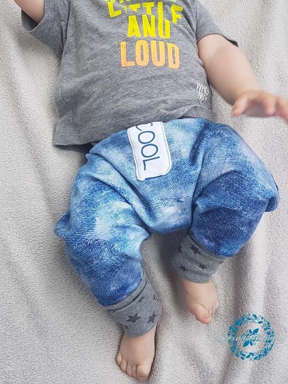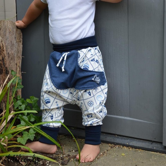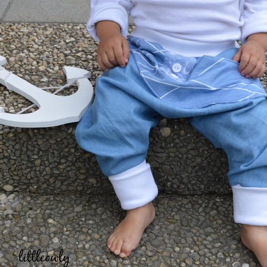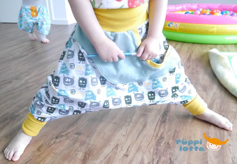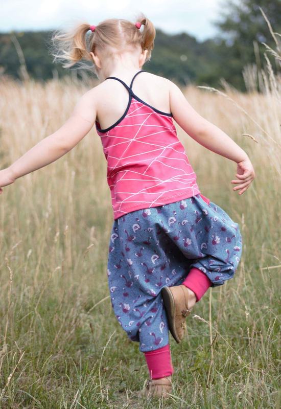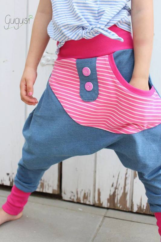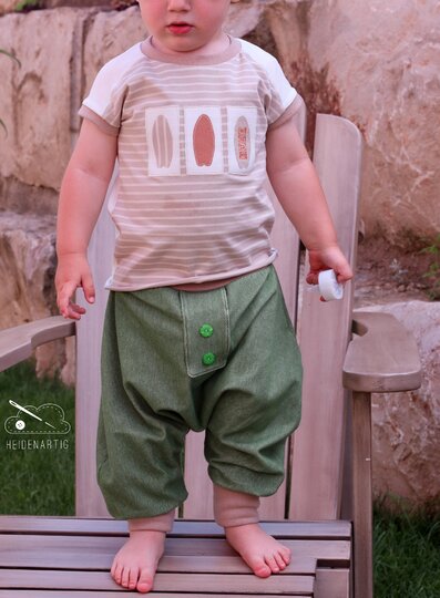 Die Hose kann aus dehnbaren Stoffen, wie Jersey oder Sommersweat genäht werden, aber auch aus fester Webware, wie Musselin oder Jeans.
