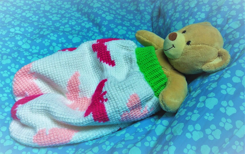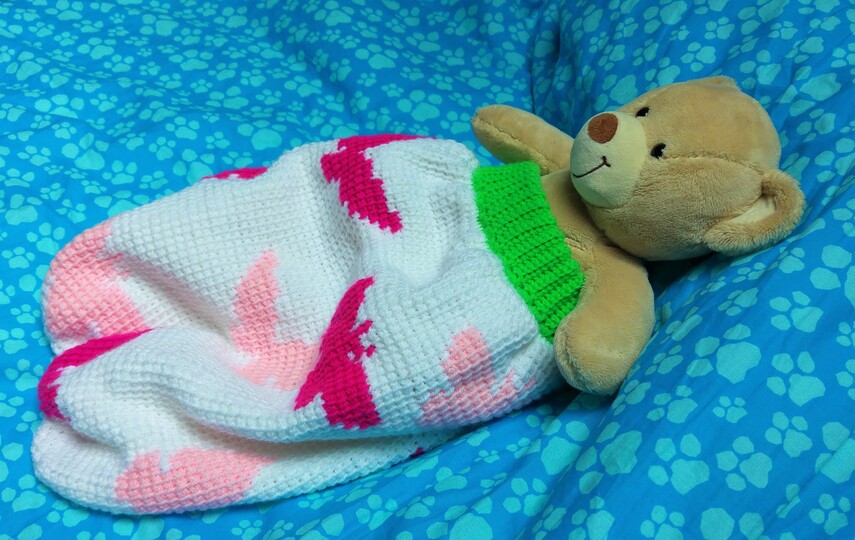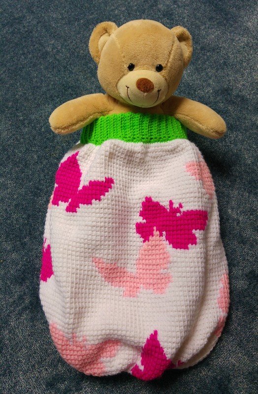 Der Schlafsack ist besonders kuschlig in kalten Winternächten. Mit den vielen Schmetterlingen läd er kleine Kinder zum träumen ein.