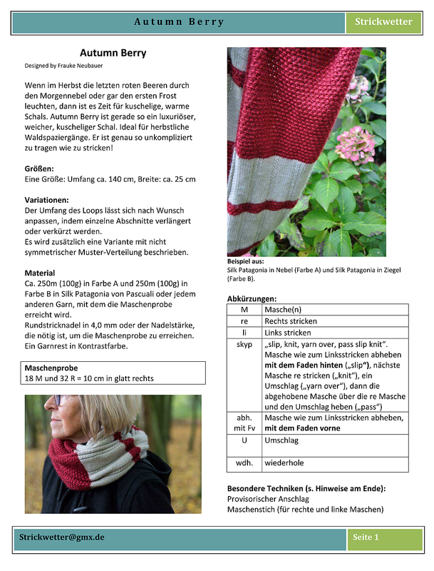 Wenn im Herbst die letzten roten Beeren durch den Morgennebel oder gar den ersten Frost leuchten, dann ist es Zeit für kuschelige, warme Schals. Autumn Berry ist gerade so ein luxuriöser, weicher, kuscheliger Schal. Ideal für herbstliche Waldspaziergänge. Er ist genau so unkompliziert zu tragen wie zu stricken.