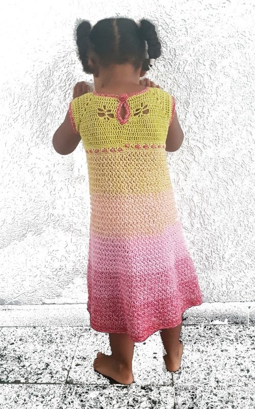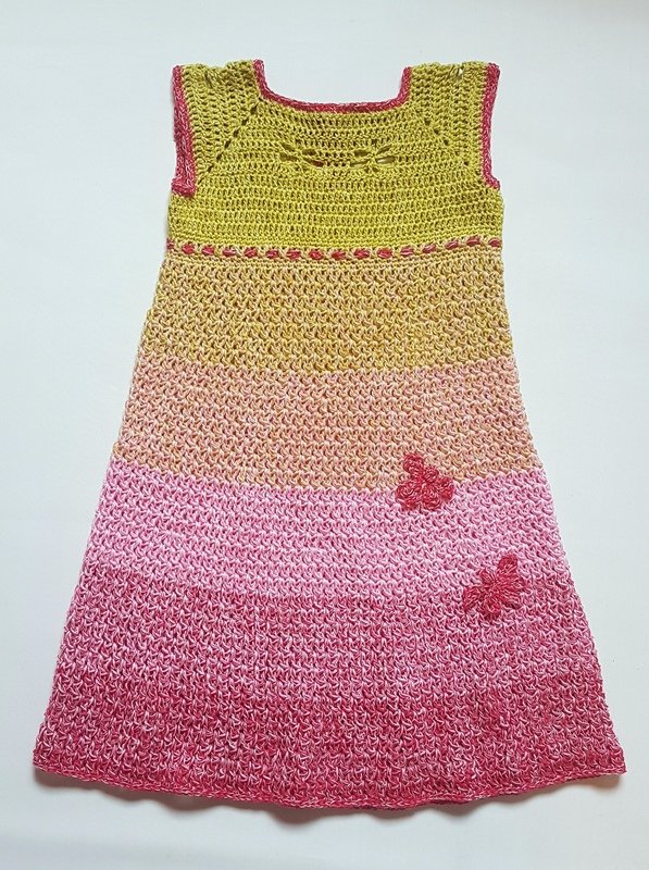 Auch kleine Damen mögen Kleider! Dieses Kinderkleid wird in Raglan Technik von oben gehäkelt und kann sehr gut an mehrere Größen angepasst werden. Ein kleiner Ausschnitt im Nacken erleichtert das Anziehen. Das luftige Kleid hat einen klassischen Schnitt und Libellen schmücken die Passe, Ärmel und den Rock. Die Libellenaplikationen am Rock werden später angenäht, die Libellen an der Passe und den Ärmeln ergeben sich aus dem Häkelmuster. Das Muster im Rockteil hat eine dichte, aber luftige Struktur und wird ohne Rundenübergänge gehäkelt, also ganz einfach:) Das Kleid kann auch von Anfängern gut nachgearbeitet werden. Anhand von Fotos,Text, Skizze für die Größen und Häkelschrift führe ich Euch durch die Anleitung und sollte eine Frage auftauchen, antworte ich zeitnah.