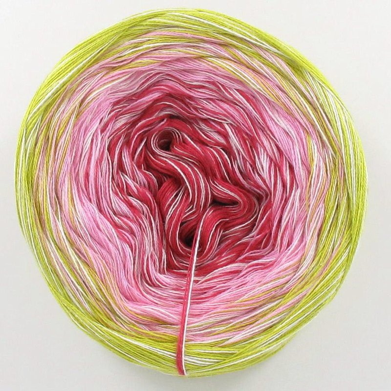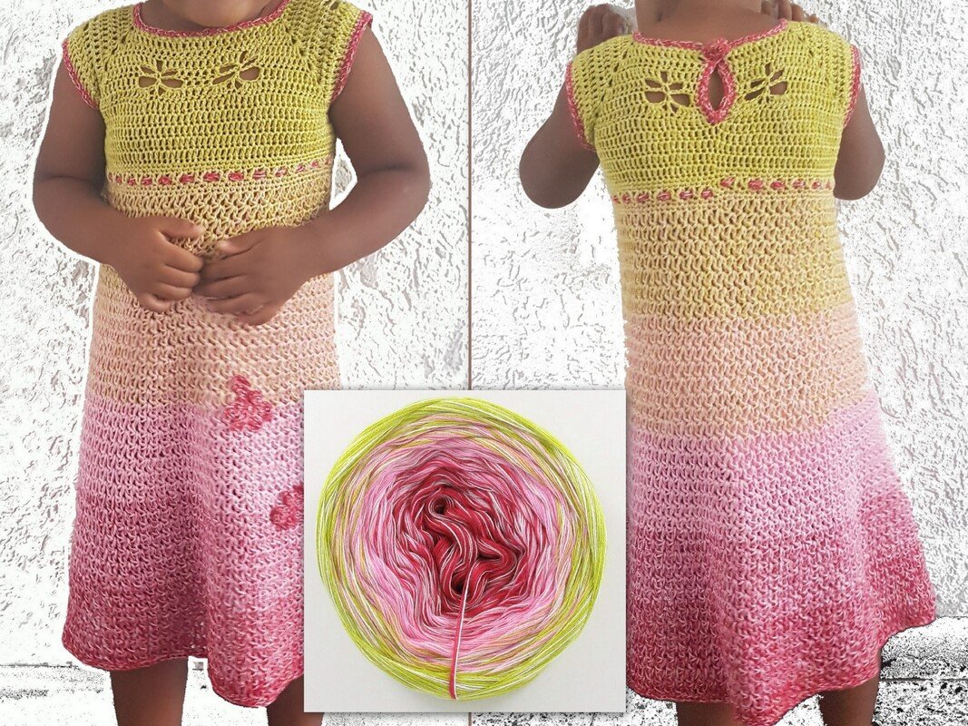 Mein Garn ist ein 4-fädriges Farbverlaufsgarn ( aus vier Farben: Apfel, Pink und Rosa, der weiße Faden läuft bei allen Farben durch und macht die Farbübergänge sanfter. Das Orginal, mit der passenden Menge zu jeder Größe, ist bei der Garn Manufaktur erhältlich. Es kann auch jedes andere Garn verarbeitet werden.