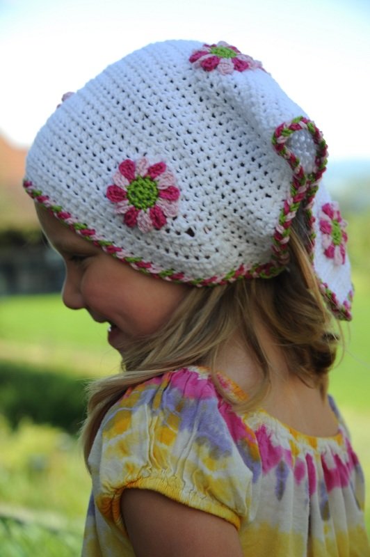 Ob als Sonnenschutz oder einfach als hübsches Accessoire - mit diesem gehäkelten Kopftuch kommen kleine Mädchen ganz groß raus! Das Kopftuch ist mit festen Maschen und halben Stäbchen schnell gehäkelt. Die zweifarbigen Blümchen werden als Applikation separat gehäkelt und anschließend aufgenäht. Ein raffiniertes Detail ist die geflochtene Umrandung, die zwar etwas zeitaufwändig aber recht einfach zu machen ist.