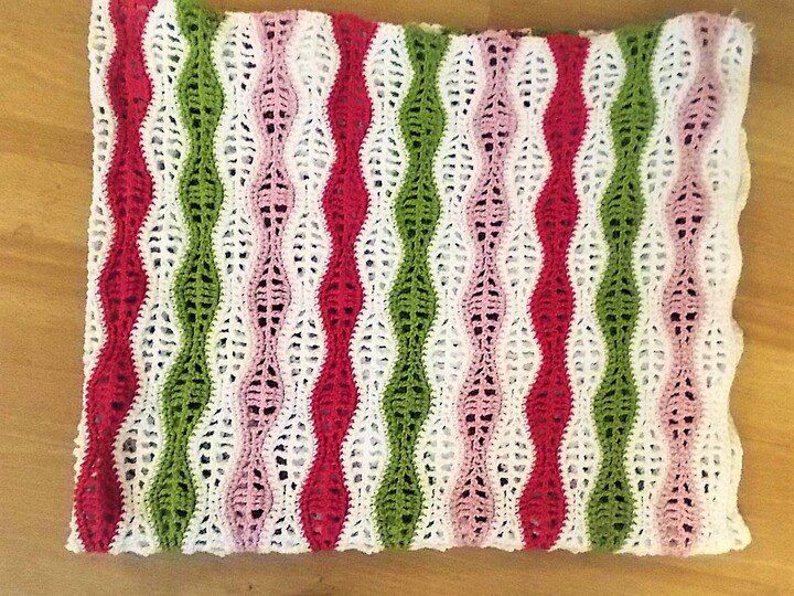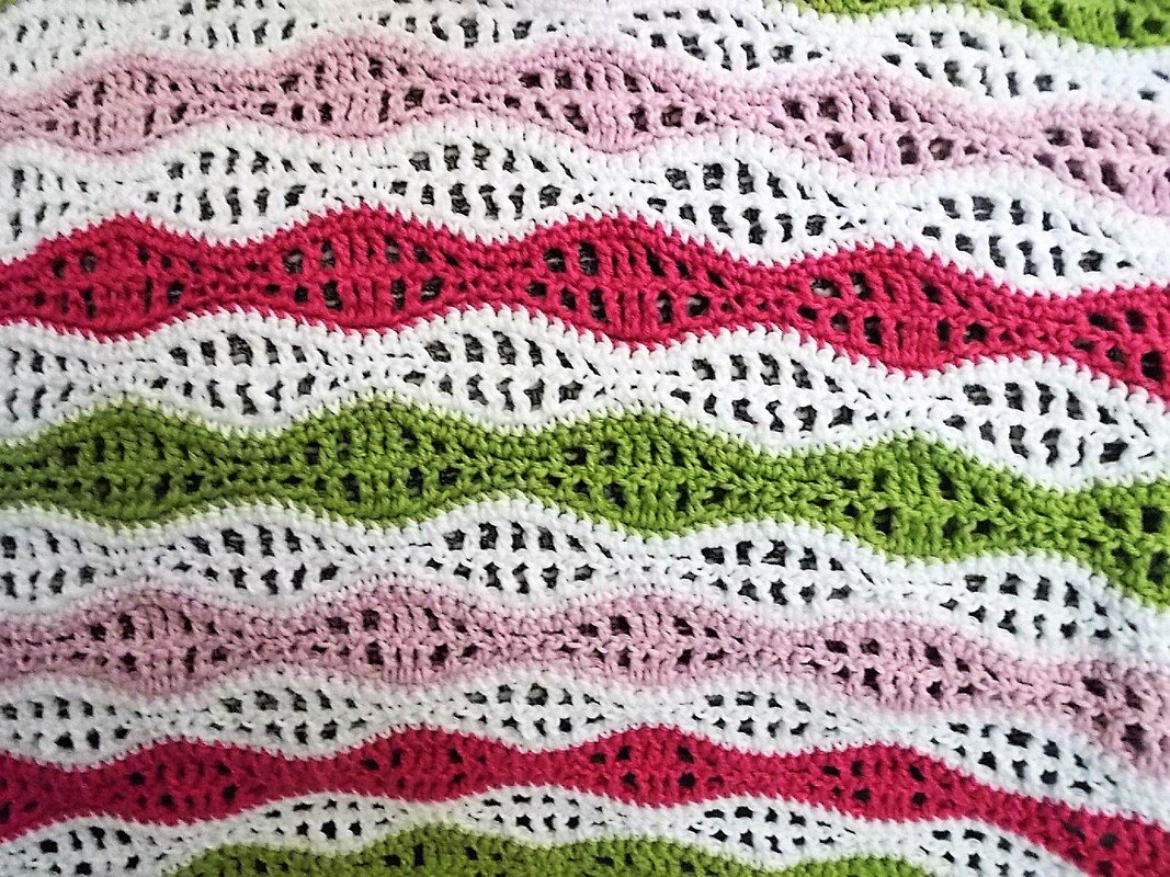 Das Wellenmuster ist Reihe für Reihe beschrieben, dazu gibt es eine von mir handgefertigte Häkelschrift.
