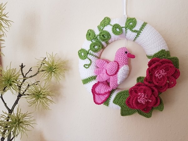 Ihr erhaltet eine ausführliche 20-seitige und reich bebilderte Anleitung für einen ca. 25 cm großen Deko-Kranz im Sommer-Outfit, mit einem Vogel, Blüten, Ranken und Blättern.