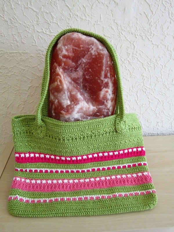 Ich habe die Tasche mit doppeltem Faden und einer Nadel 3,5 gehäkelt. Die LL des Baumwollgarns ist 160m/50g. Verwendet habe ich Drops SAFRAN. Wer lieber mit nur einem Faden arbeitet, dem empfehle ich ein Garn mit einer Lauflänge 80m/50g bei gleicher Nadelstärke, z.B. Drops PARIS.