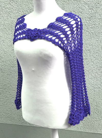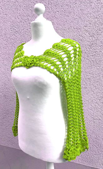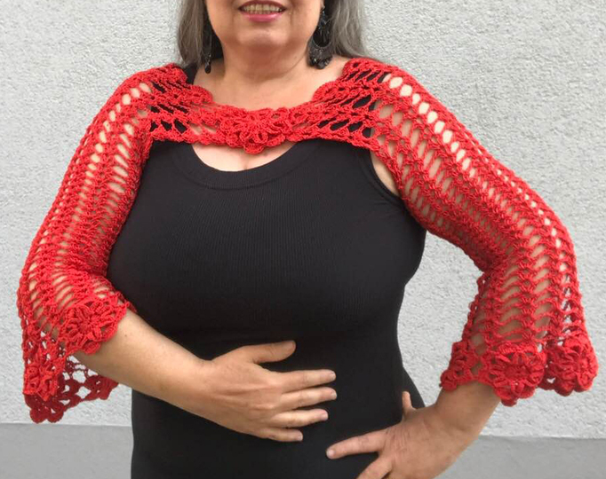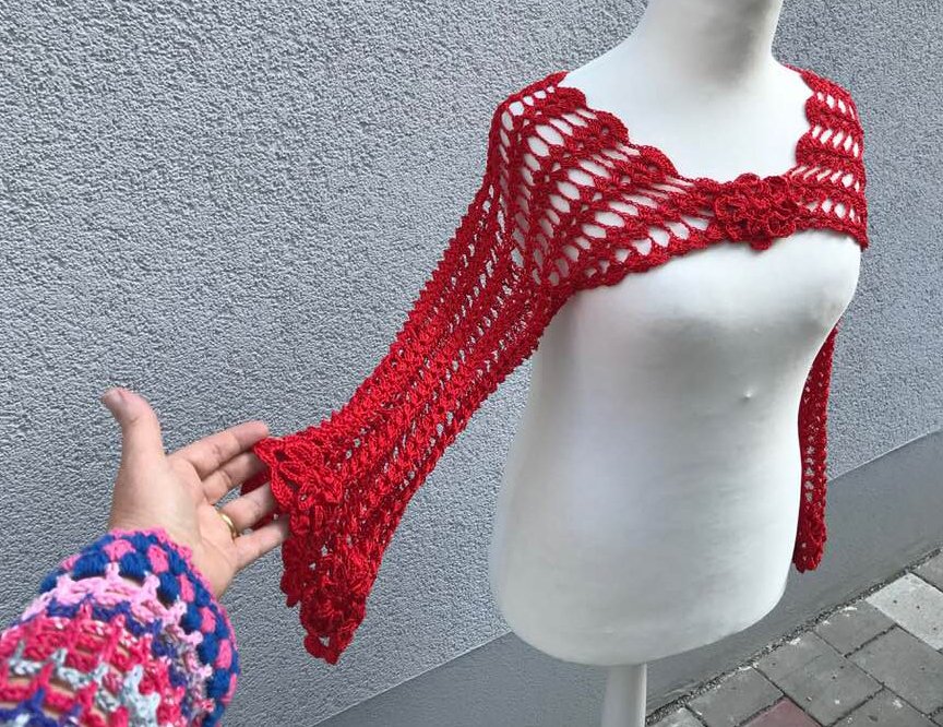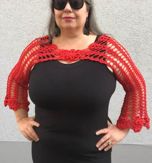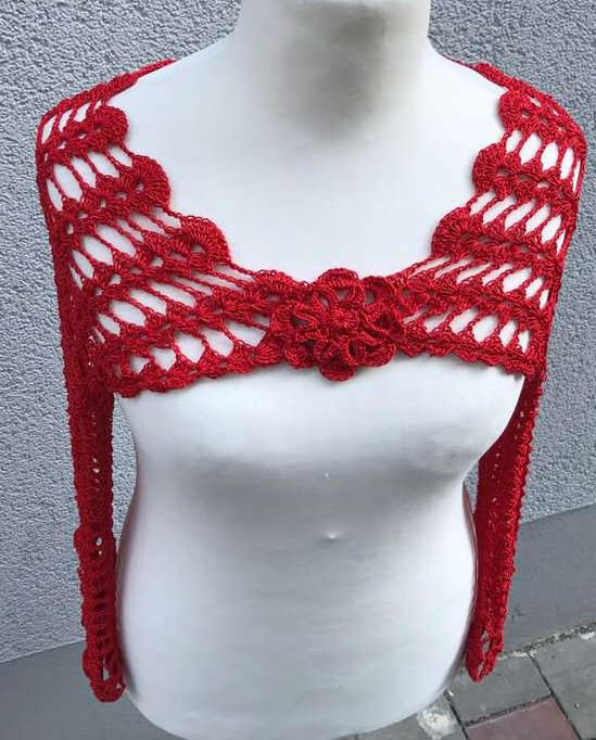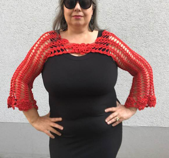 Nun kannst Du alle ärmellosen Kleider und Shirts kaufen und auch wieder tragen, denn Ruckzuck ist das passende Bolero Oberarme "ADE " BlumenTrompete, in der selben Farbe gehäkelt...
