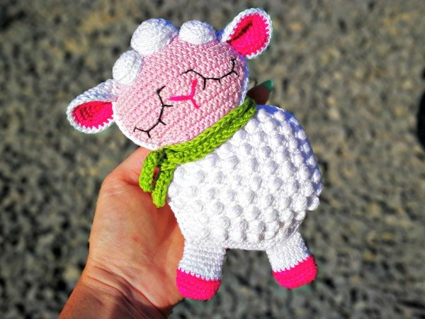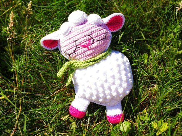 Mit der Angegebenen Wolle wird dein Schäfchen ca. 13 cm hoch, zusatzlich kannst du in dein Schäfchen Rasseln oder Quitscher einbauen, ein Perfektes Spielzeug für Babys.