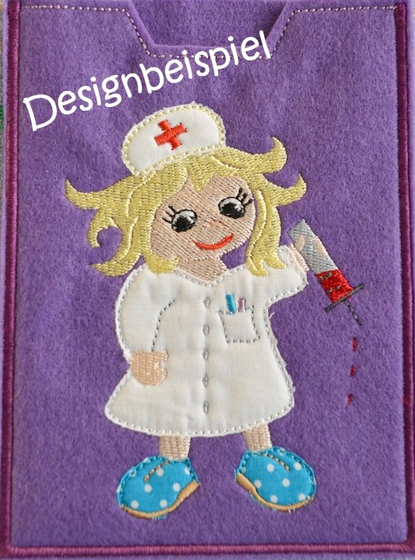 Bist du als Pflegende tätig und würdest gerne deine Einsatzpläne (gefaltet) oder auch viele andere Dinge wie Ausweise, Pässe oder Impfausweise u.s.w. in eine tolle Verpackung stecken? Oder suchst du ein Geschenk für eine Pflegefachperson? Oder möchtest du Kissen, Taschen und Shirts verzieren und hast kein geeignetes Motiv? Dann kommt diese Pflegefachfrau genau richtig. Einmal mit Spritze und einmal mit Fieberthermometer in Form von einer Hülle oder auch als gewöhnliche Stickdatei kannst du deiner Fantasie freien Lauf lassen. Die Hüllen werden auf festen Filz oder festem Kunstleder gestickt. Die Schuhe, das Kleid und die Haube sind Applikationen, daher sind die witzigen Frauen schnell gestickt. Am Schluss wird alles ausgeschnitten und fertig. Keine Wende-Öffnung! Im ITH Stickdateien-Paket findest du insgesamt 4 Dateien. Die Hüllen haben die Masse von 10,5 x 15,5 cm. Die Motive sind 11,5 x 7,5 cm. Alle ITH-Stickdateien werden im 13x18 Rahmen gestickt.