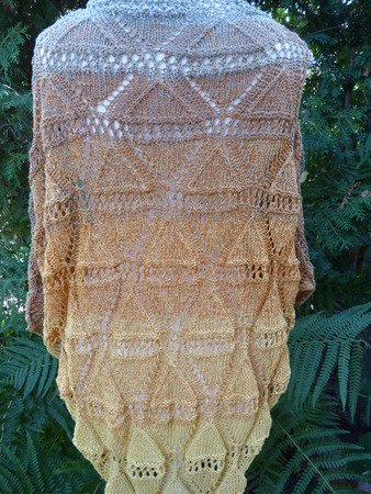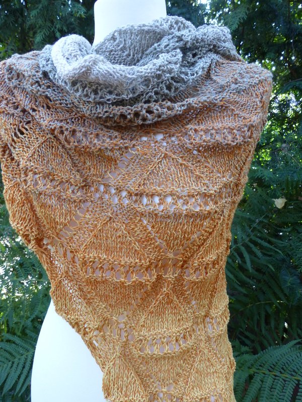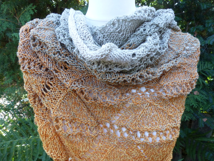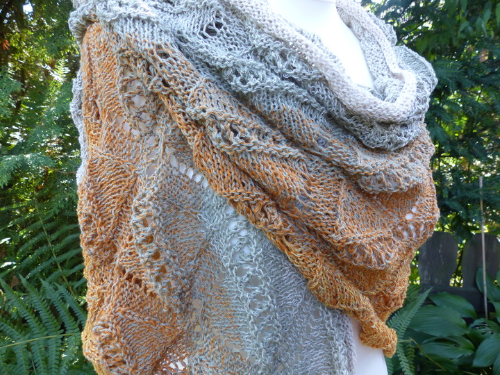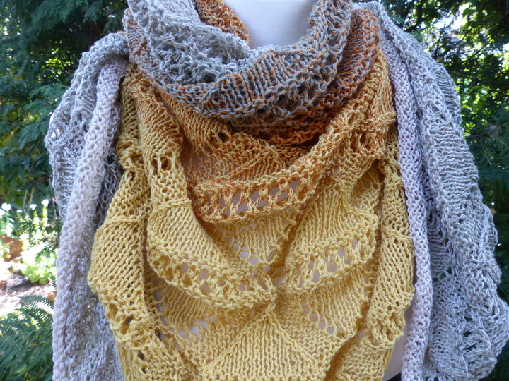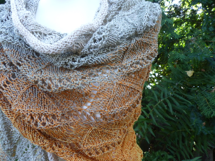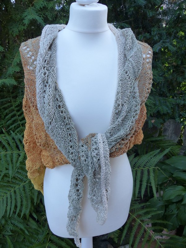 Ich habe für das kleine Tuch Schachenmayr Tahiti 100 g (280 m / 50 g) verarbeitet, für das große Tuch habe ich Lana Grossa "Shades of Cotton Linen" 840 m / 200 g verstrickt.