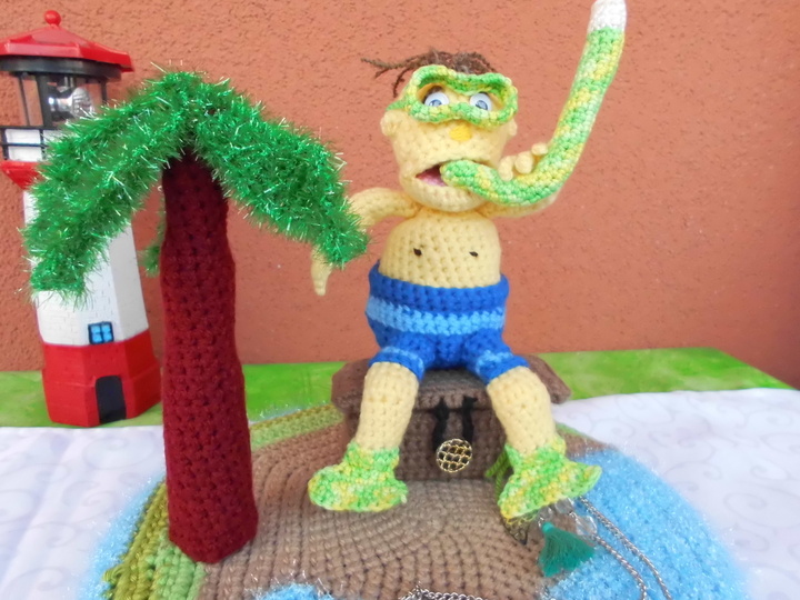 Hier kommt die Häkel-Anleitung für den Taucher mit seiner geborgenen Schatztruhe, der Palme und die Insellandschaft mit vielen Möglichkeiten zum vervollständigen.