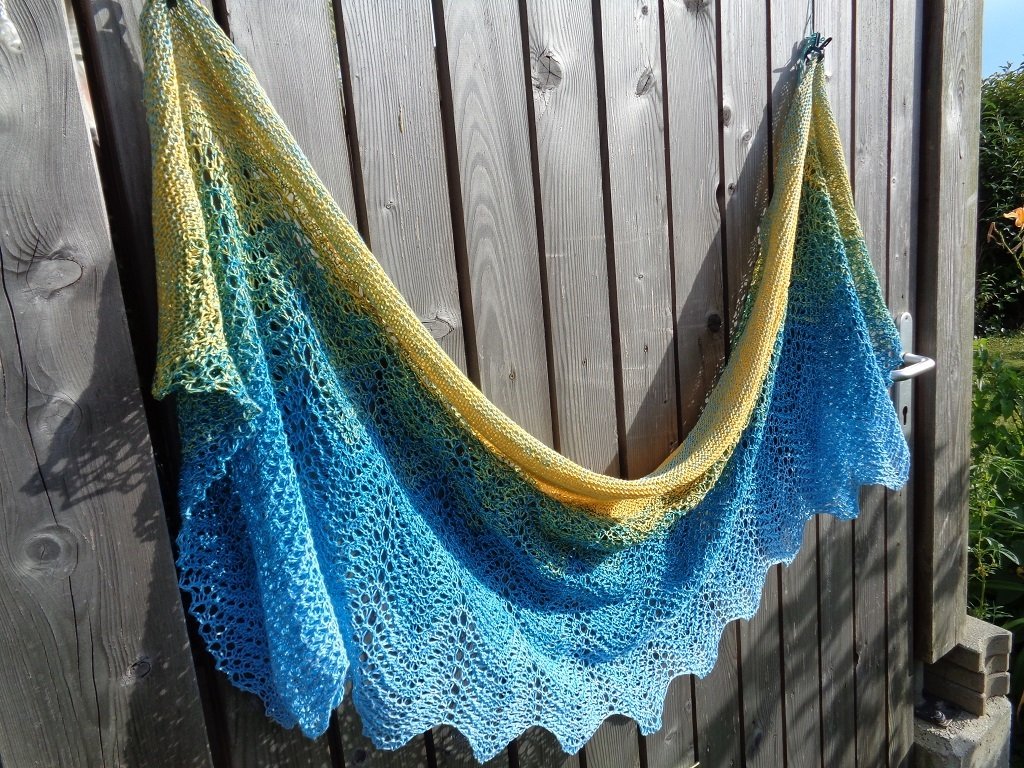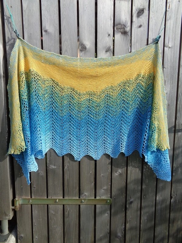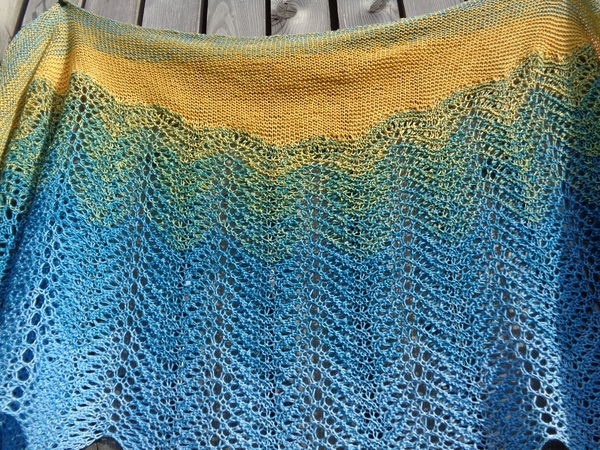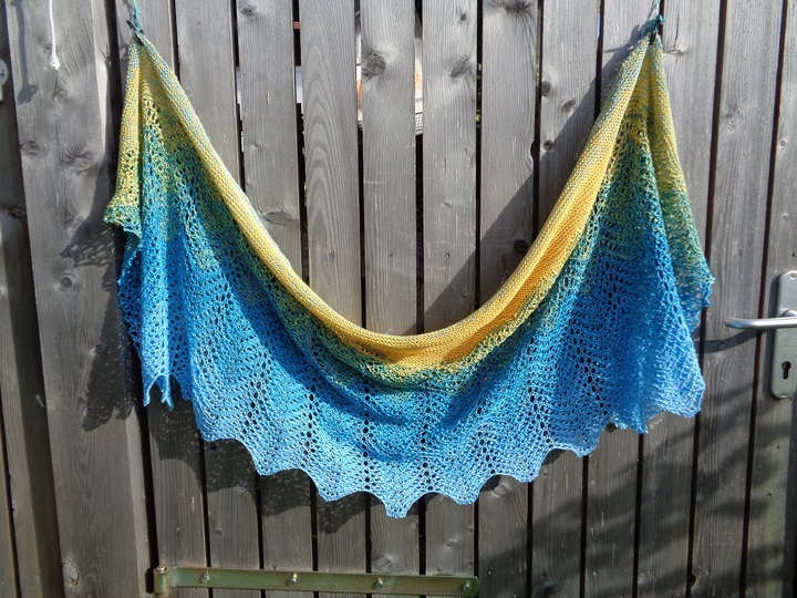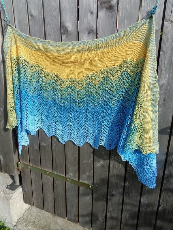 Blaue Wellen, goldene Sonne, strahlend blauer Himmel. Dieses Schaltuch wird im Farbverlauf von unten nach oben gestrickt und ist definitiv ein exklusiver Hingucker in Ihrer Garderobe.