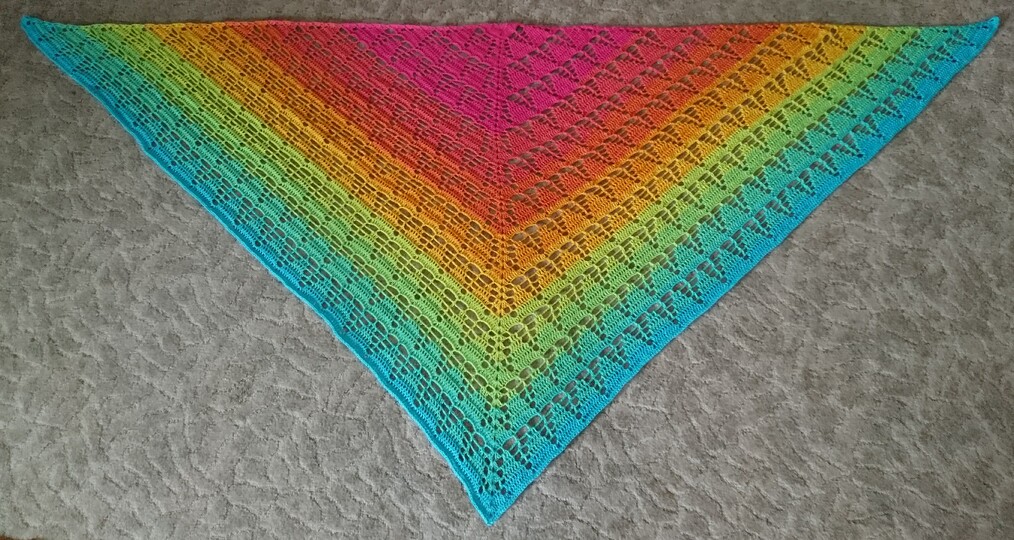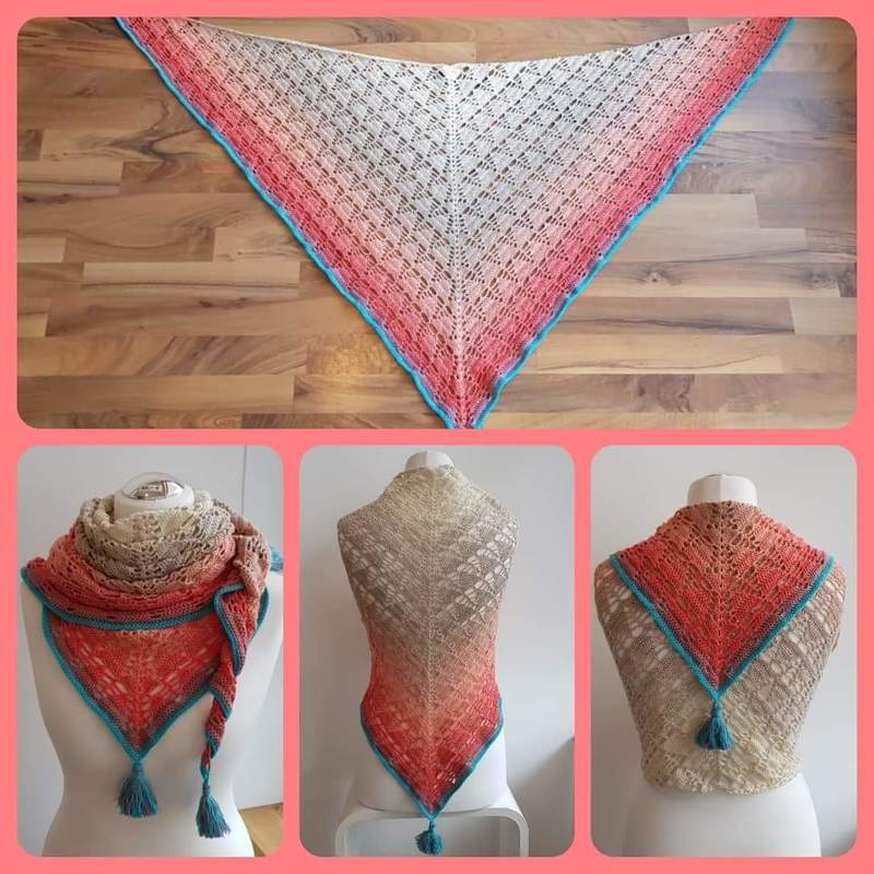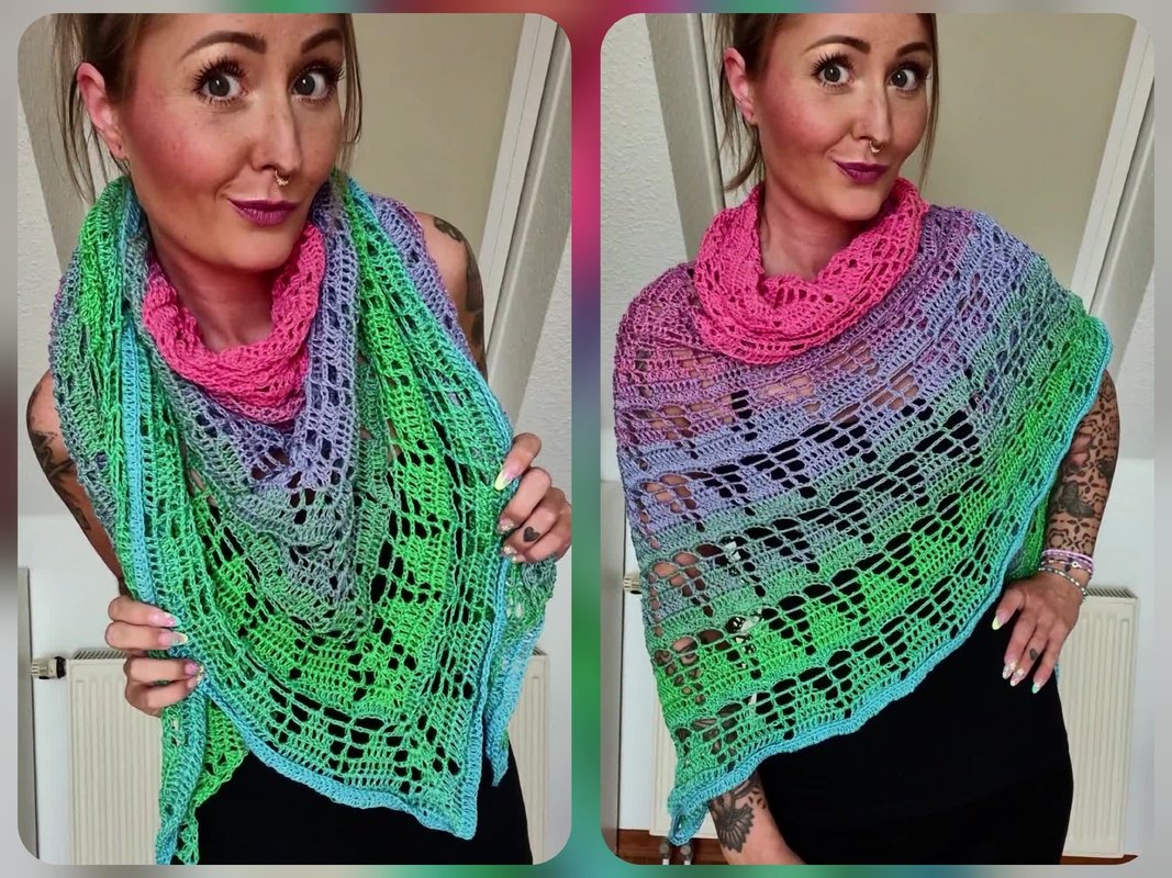 Für das Tuch werden mindestens 750m Farbverlaufsgarn benötigt. Nach oben hin sind euch bei der Lauflänge keine Grenzen gesetzt. Natürlich könnt Ihr auch jedes andere Garn nutzen.