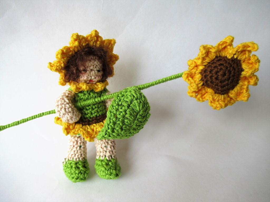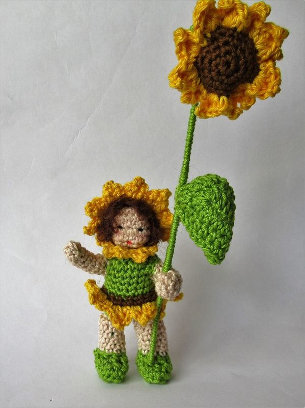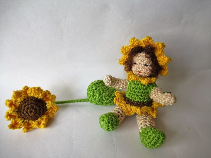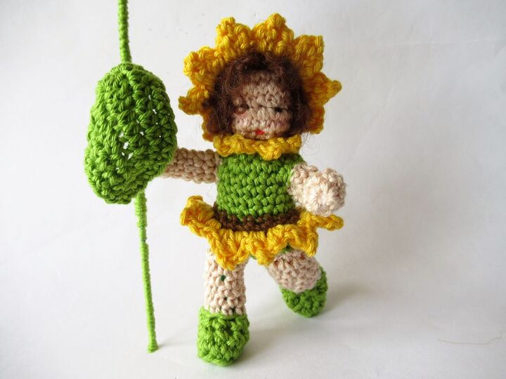 Das Blumenkind wird (ohne Blume) etwa 12 cm groß, die Sonnenblume misst etwa 20 cm. Du kannst es aus vorhandenen Wollresten häkeln, denn der Materialverbrauch ist gering.