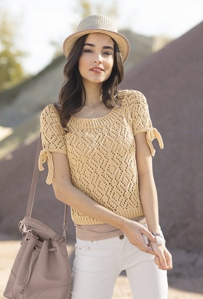 Die Details machen den Look. Bei diesem aparten Strickshirt stehen die Kurzärmel mit Bindebändern im Mittelpunkt.