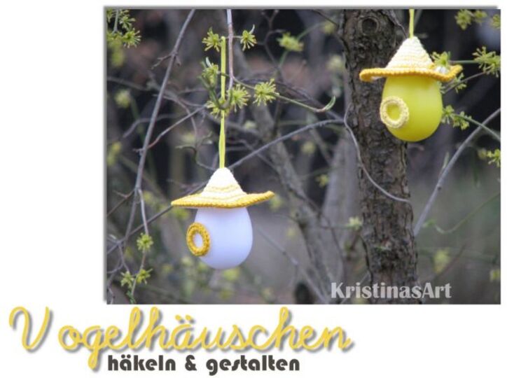 Gratisanleitung zum Häkeln und Gestalten eines Vogelhäuschens, du benötigst nur ein Kunststoffein, Häkelgarn, Häkelnadel und etwas Klebstoff...