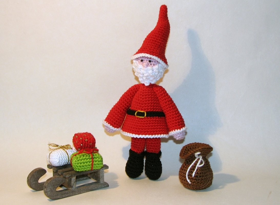 Du möchtest auch so einen süßen Weihnachtsmann häkeln? Mit dieser detailliert bebilderten Anleitung ist das ganz einfach. Die Anleitung beinhaltet nicht nur die Beschreibung für den Weihnachtsmann, auch der Sack und die Geschenke werden erklärt. Das Häkeln von Bart und Frisur werden ebenfalls genau beschrieben.