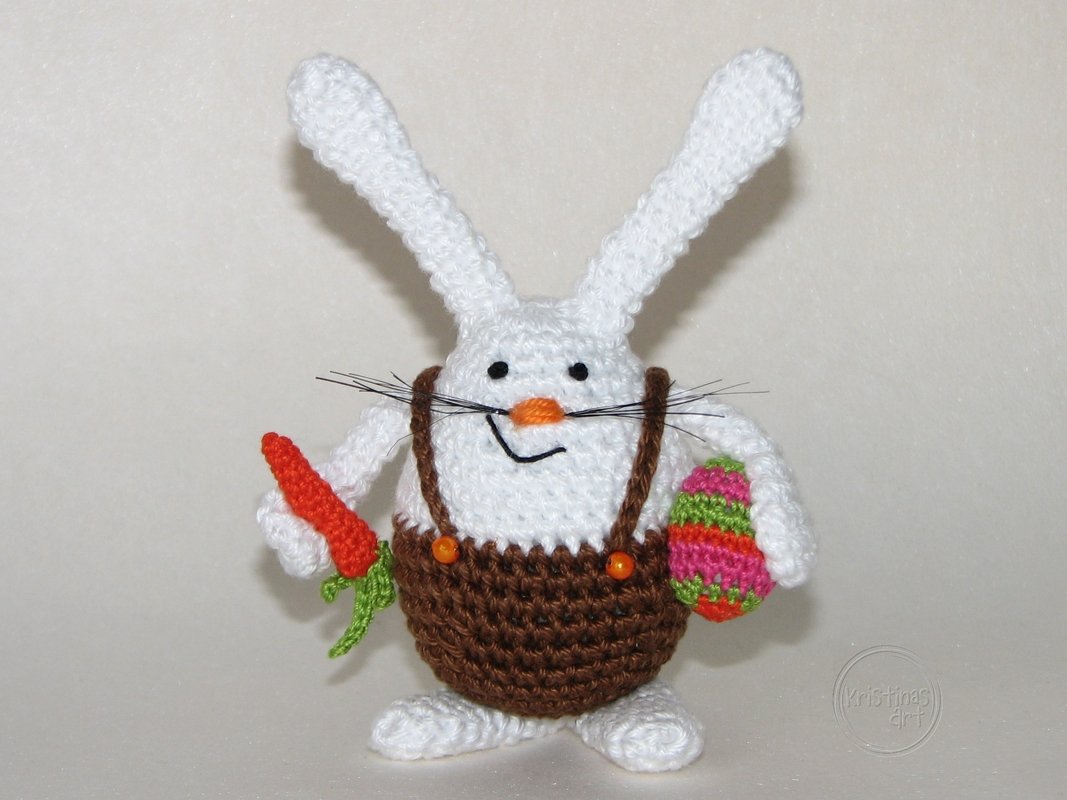 Materialbedarf: für die Hasen Baumwollgarn Laufl. 125m/50g, Häkelnadel Stärke 2, für Möhre & Ei: Filet-Häkelgarn, Laufl. ca. 260m/50g & Häkelnadel Stärke 1,25, Füllwatte, schwarzes Filethäkelgarn