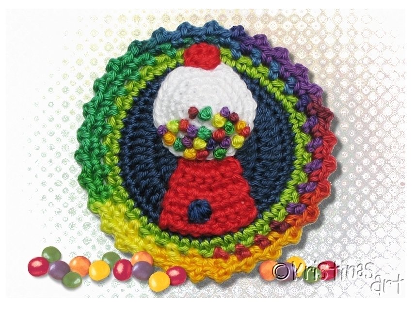 Häkel dir eine coole Kaugummiautomat-Applikation, gefüllt mit kunterbunten Kaugummis.