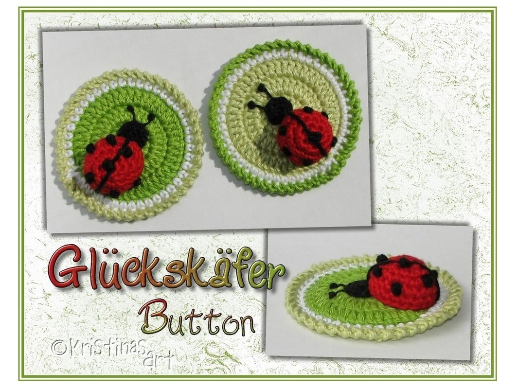 Bei Verwendung von Baumwollgarn mit einer Lauflänge von 125m/50g und einer Häkelnadel Stärke 2 hat der Button einen Durchmesser von 6,5 cm.