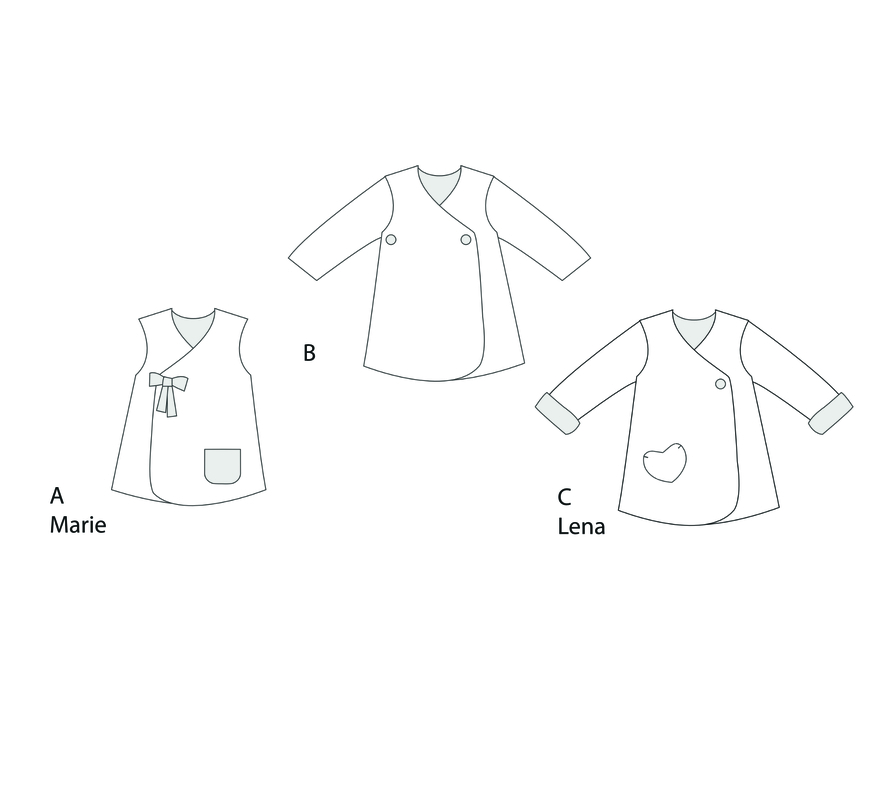 Mit dem Schnittmuster LENA nähst du drei bezaubernde Varianten für Mädchen: Wickeljacke, Tunika oder Kleid. Je nach Stoffwahl entsteht ein luftiger Sommer-Look oder ein warmes Teil für die kühle Jahreszeit. Ideal für individuelle, handgemachte Outfits mit hohem Tragekomfort.